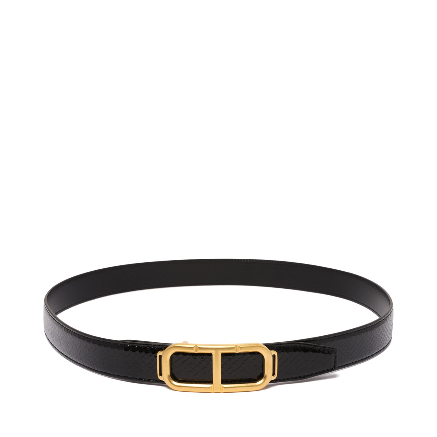 Tom Ford Black Printed Leather Stadium T Belt. Black leather belt with 100% brass hardware with gold galvanization.