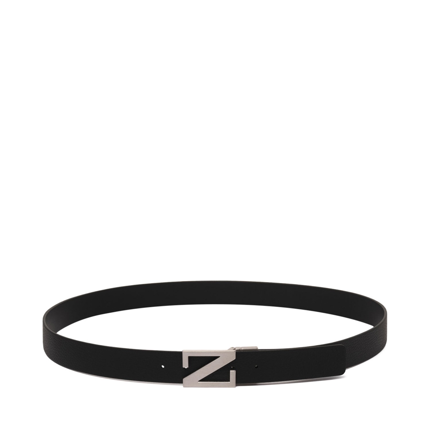 Zegna Black Monogram Buckle Belt. Black grained leather belt, Zegna Monogram buckle in the classic polished silver finish.