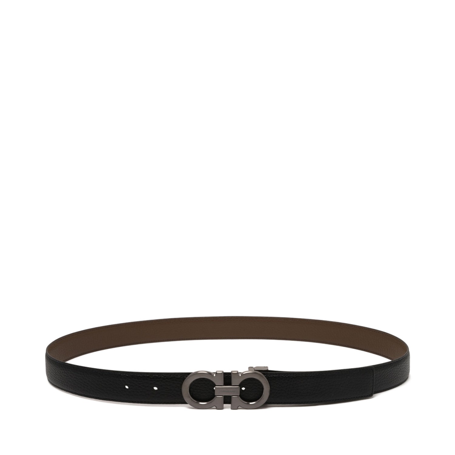 Ferragamo Black Clay Reversible and Adjustable Gancini Belt. Versatile and cool with a current appeal, this new Ferragamo belt has a two-tone reversible shaft made of hammered calfskin leather with a rich, pebbled texture. The different colors on each side open up several styling options, and the tonal Gancio buckle has a central signature. The length is adjustable.