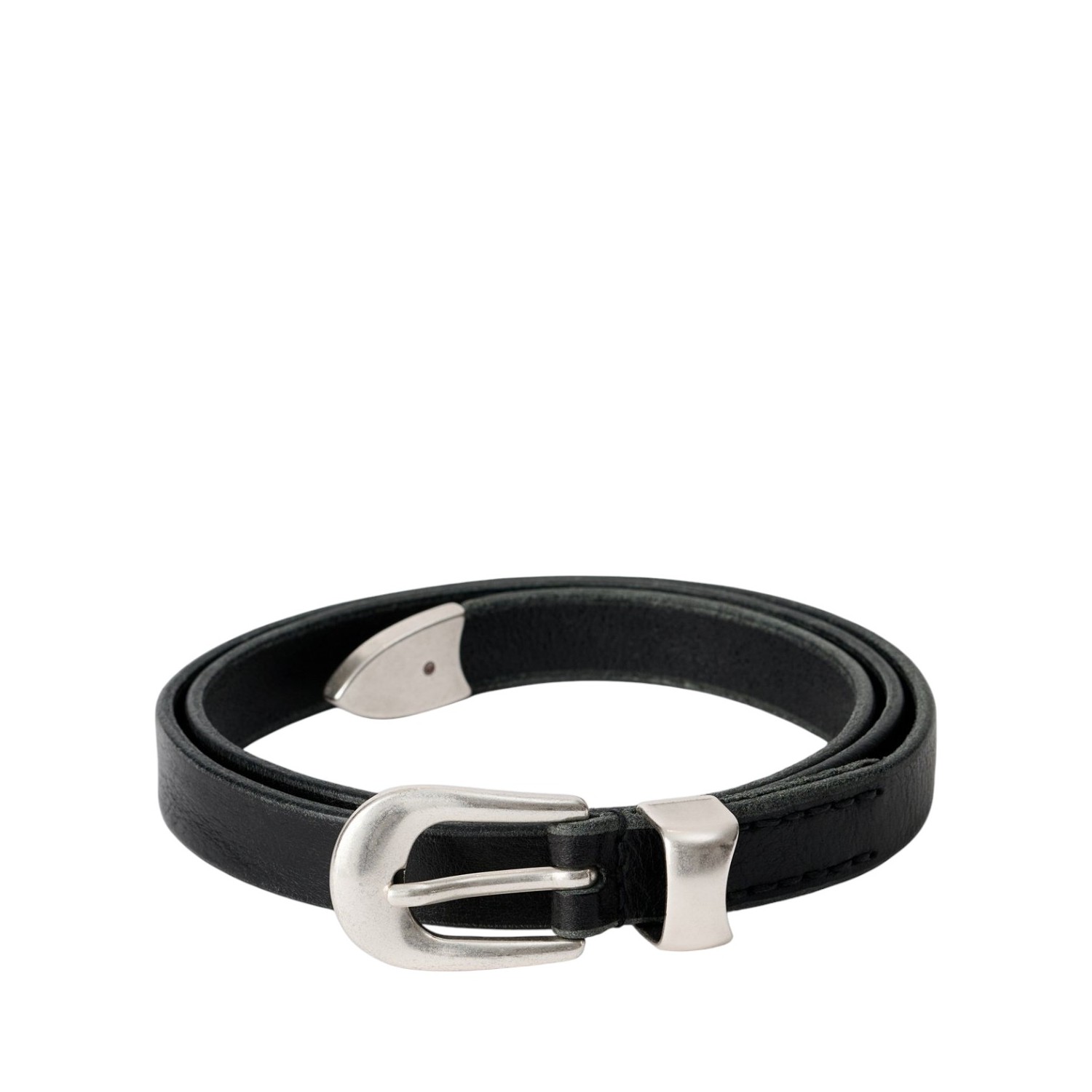 Our Legacy Black Leather Belt. Black Italian leather belt with metal pin buckle closure, metal tip and single keeper.