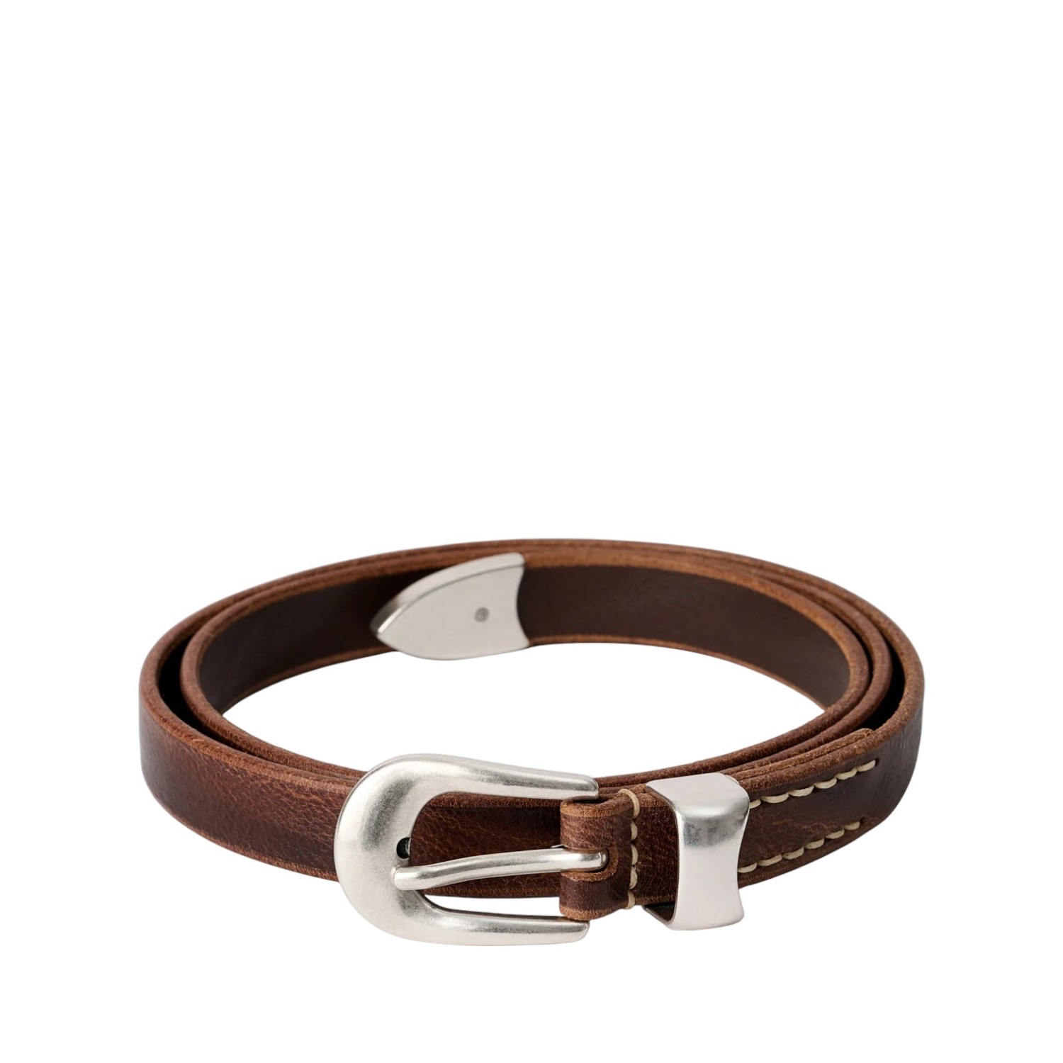 Our Legacy Brown Leather Belt. Brown leather belt with metal pin buckle closure, metal tip and single keeper.