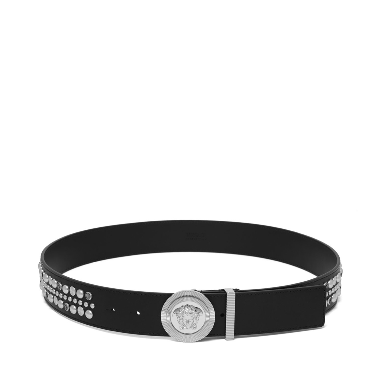 Versace Black Medusa Biggie Decorated Belt. Black crafted from studded and crystal-embellished calfskin, the belt features a Medusa Biggie buckle closure and a detailed loop.