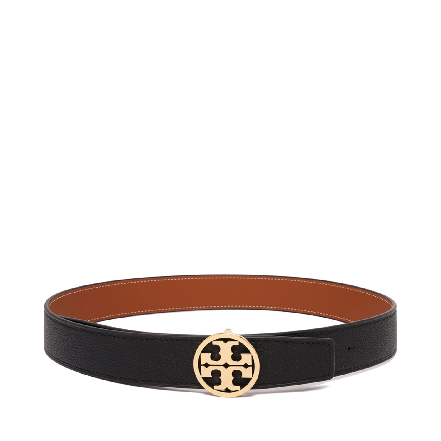 Tory Burch Black and Brown Reversible Miller Belt. Black and brown hammered leather reversible belt with buckle closure with circular logo, gold or silver details.