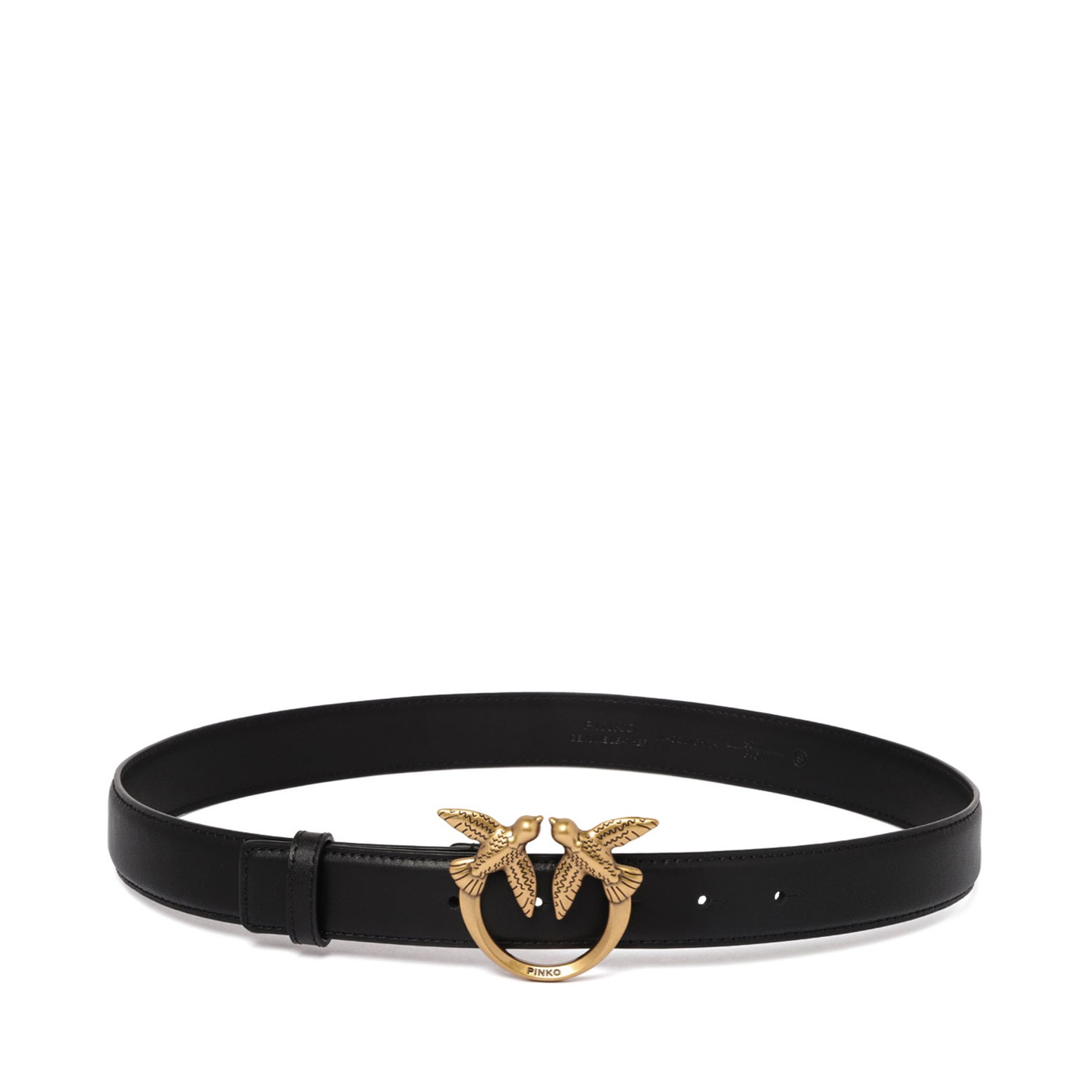 Pinko Black Love Bery Belt. Black belt, pin fastening, punched holes, flat tip, signature Love Birds buckle.