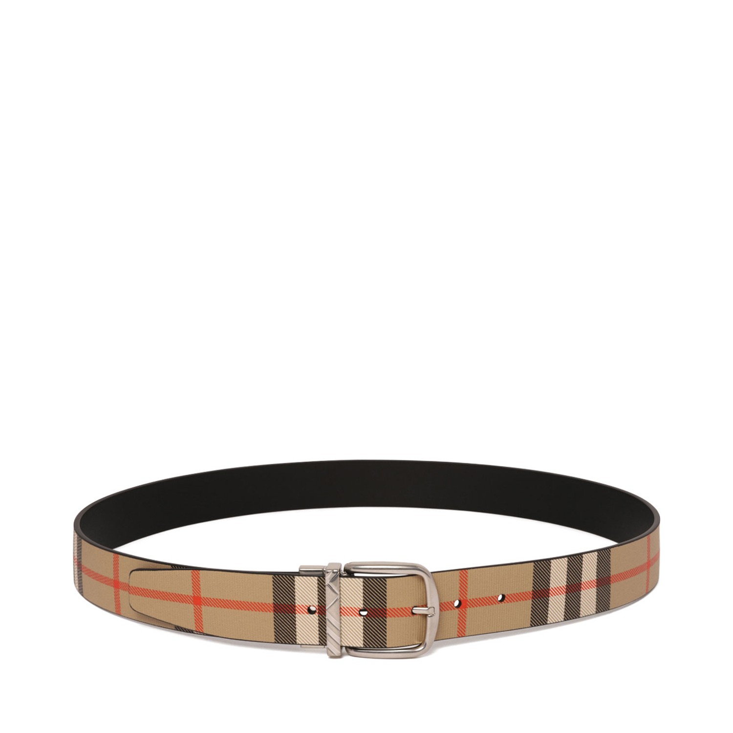Burberry Reversible Belt With Check Buckle. Sand beige and black belt with adjustable closure with palladium-plated metal buckle with engraved check pattern. Burberry lettering embossed on the reverse, side i in coated cotton blend with sand beige Burberry check print, side ii in smooth black leather.