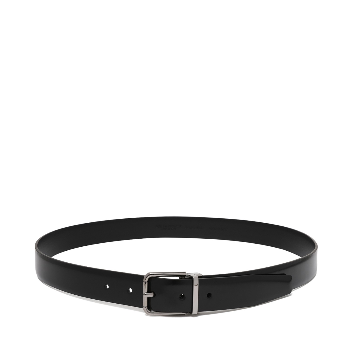 Dolce & Gabbana Black Leather Belt. Black leather belt with a sleek, timeless design. Crafted in smooth premium calfskin, this Dolce & Gabbana belt combines refined craftsmanship with everyday versatility. Featuring a classic silver-tone metal pin buckle and adjustable perforated strap for a customized fit. The minimalist silhouette and polished finish make it a sophisticated accessory, perfect for both formal tailoring and elevated casual looks.