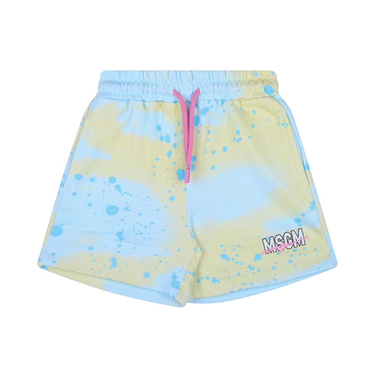 MSGM Kids Spray Paint Effect Shorts. Pastel yellow cotton shorts with paint effect, elasticated drawstring waistband. Two side inset pockets, rear patch pocket, logo print to the front.