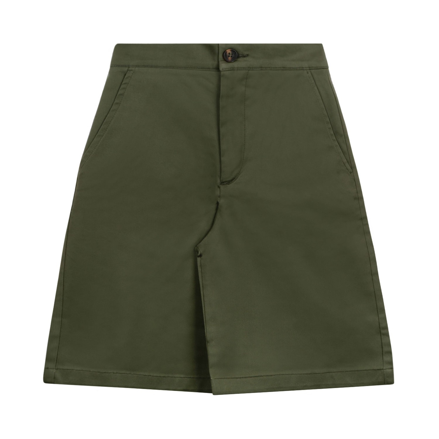 Golden Goose Kids Olive Green Chino Shorts. Olive green cotton blen chino shorts, logo embroidered on the back, elasticated waist on the back. Front closure with button and zip, two diagonal side pockets, shaped back pocket, straight cut.