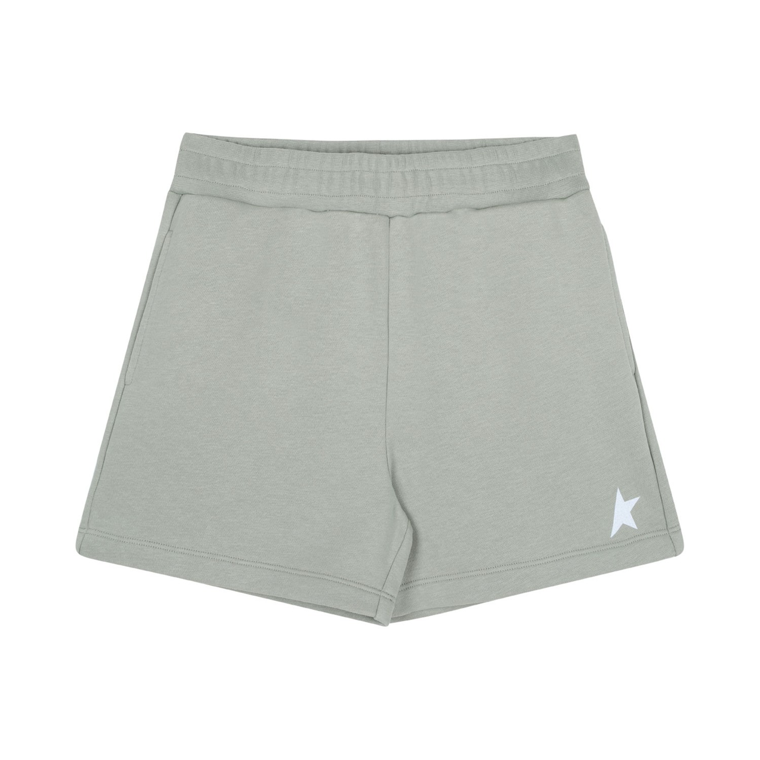 Golden Goose Kids White and Seagrass Star Print Shorts. White and seagrass cotton shorts, jersey knit, white star print, elastic waistband, slip-on style and thigh-lenght.