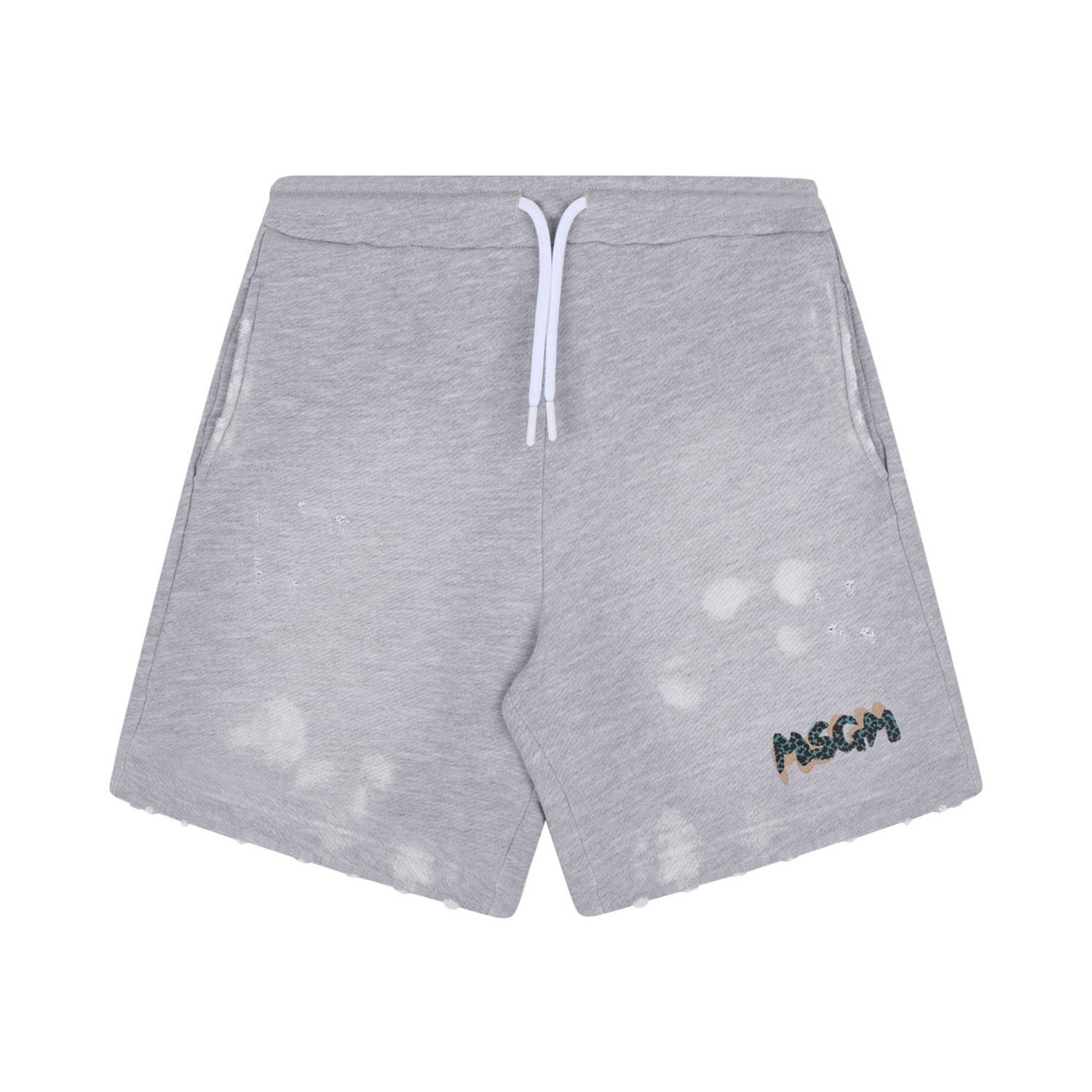 MSGM Kids Distressed Shorts. Timberwolf grey cotton shorts with elasticated drawstring waistband, two side inset pockets, logo print to the front.