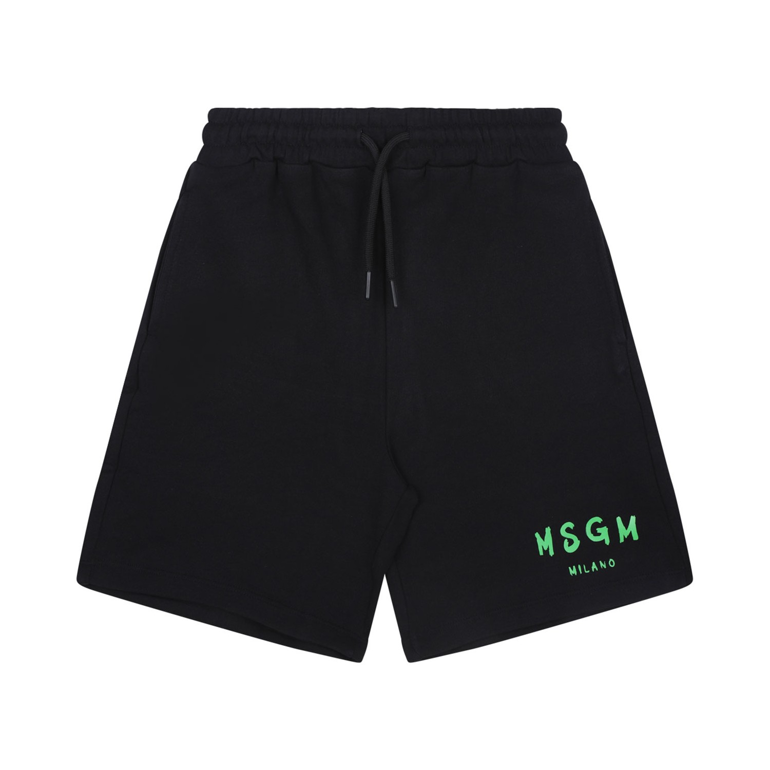 MSGM Kids Black Logo Print Shorts. Black cotton shorts, jersey texture, elasticated drawstring waistband, two side slit pockets. Logo print at the leg, rear patch pocket, French terry lining.