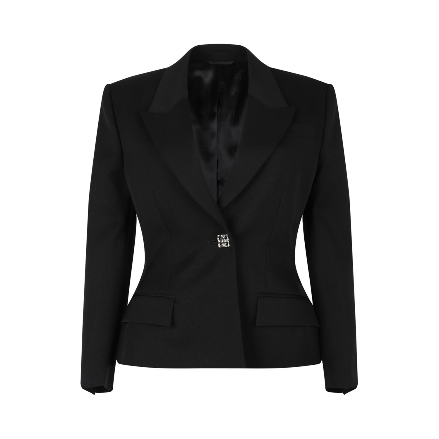 Givenchy Black 4G Blazer. Black virgin wool blazer, peak lapels, long sleeves, buttoned cuffs. Chest welt pocket, dart detailing, two side flap pockets. Internal slip pocket, logo jacquard lining, staright hem, 4G Liquid metal button, front button fastening.
