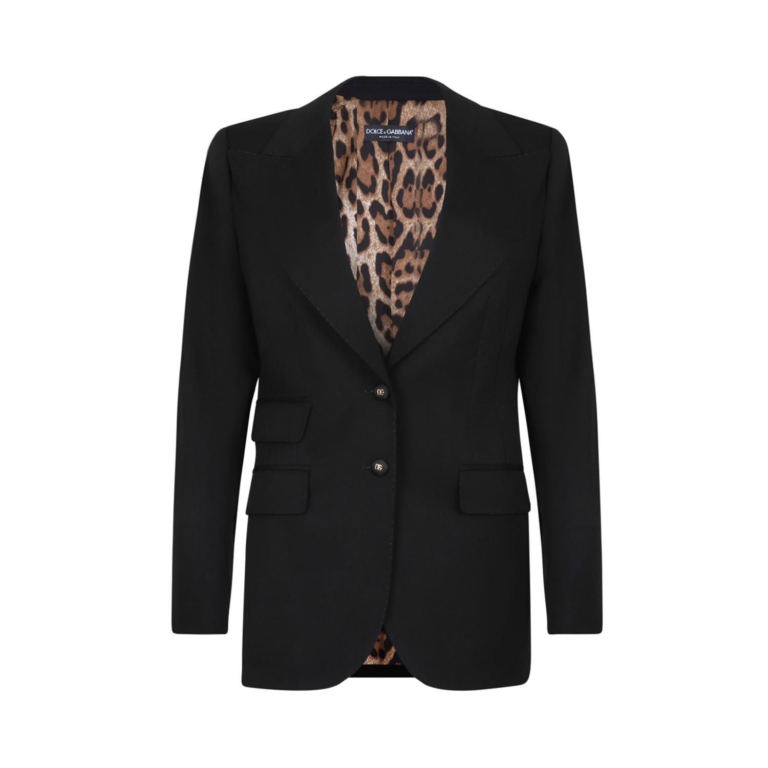 Dolce & Gabbana Black Turlington Blazer. Black Turlington blazer in gabardine with stitching, single breasted, peak lapels. Long sleeves, double pocket, flap pockets. Lined in leopard-print stretch satin and closure with cannette-covered buttons with DG logo.