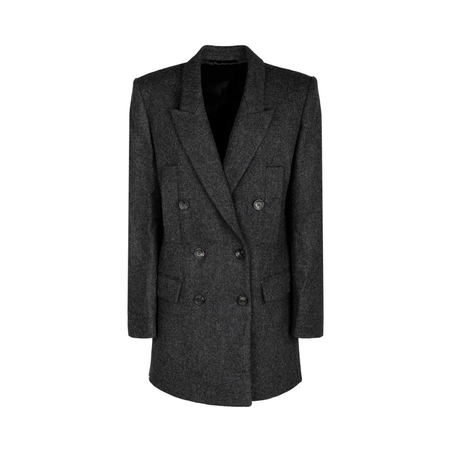 Isabel Marant Dark Grey Floyd Blazer. Dark grey virgin wool blazer, notched lapels, shoulder pads, long sleeves. Buttoned cuffs, chest welt pocket, double breasted button fastening, two front flap pockets. American rear vent, straight hem, full lining.
