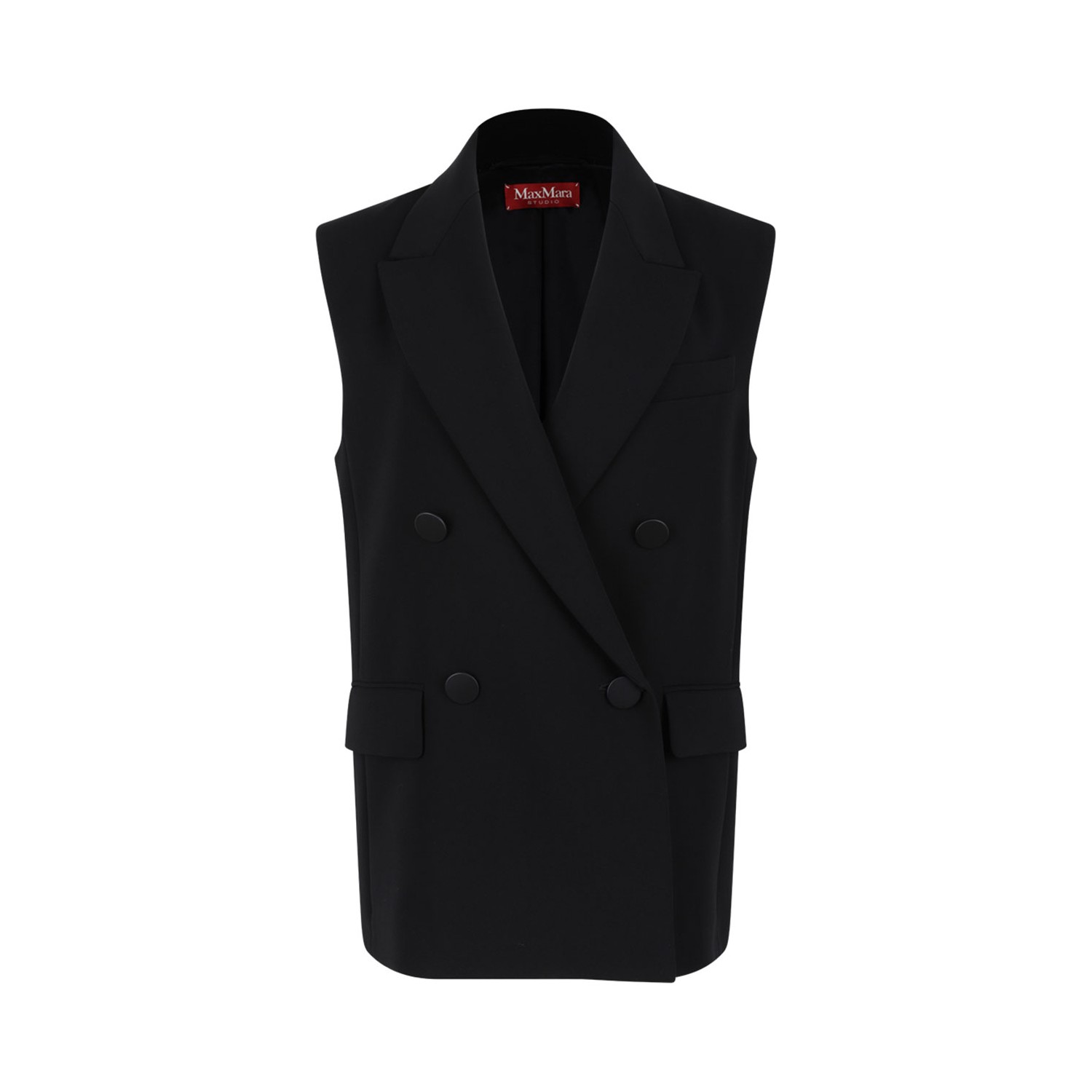 Max Mara Black Sleeveless Blazer. Black sleeveless blazer in structured wool blend with peak lapels and double-breasted button closure. Flap pockets on the sides and a welt chest pocket add classic tailoring details. Finished with tonal buttons and a sharp silhouette, it combines elegance and modern minimalism.