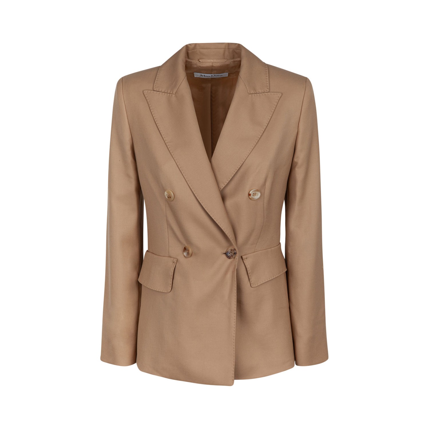 Max Mara Osanna Light Beige Blazer. Double-breasted blazer made of fine wool gabardine. Model with a semi-fitted silhouette, with peak lapel collar, welt pockets with flap applied on the front and set-in sleeves with buttons on the cuffs. Lined in customized fabric, it is finished with a central vent on the back and front closure with visible buttons.