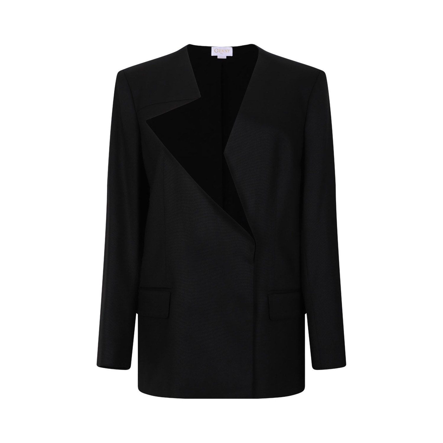 Genny Black Contrasting Panel Blazer. Black contrasting panel blazer with V-neck, long sleeves, structured shoulders and single-breasted closure.