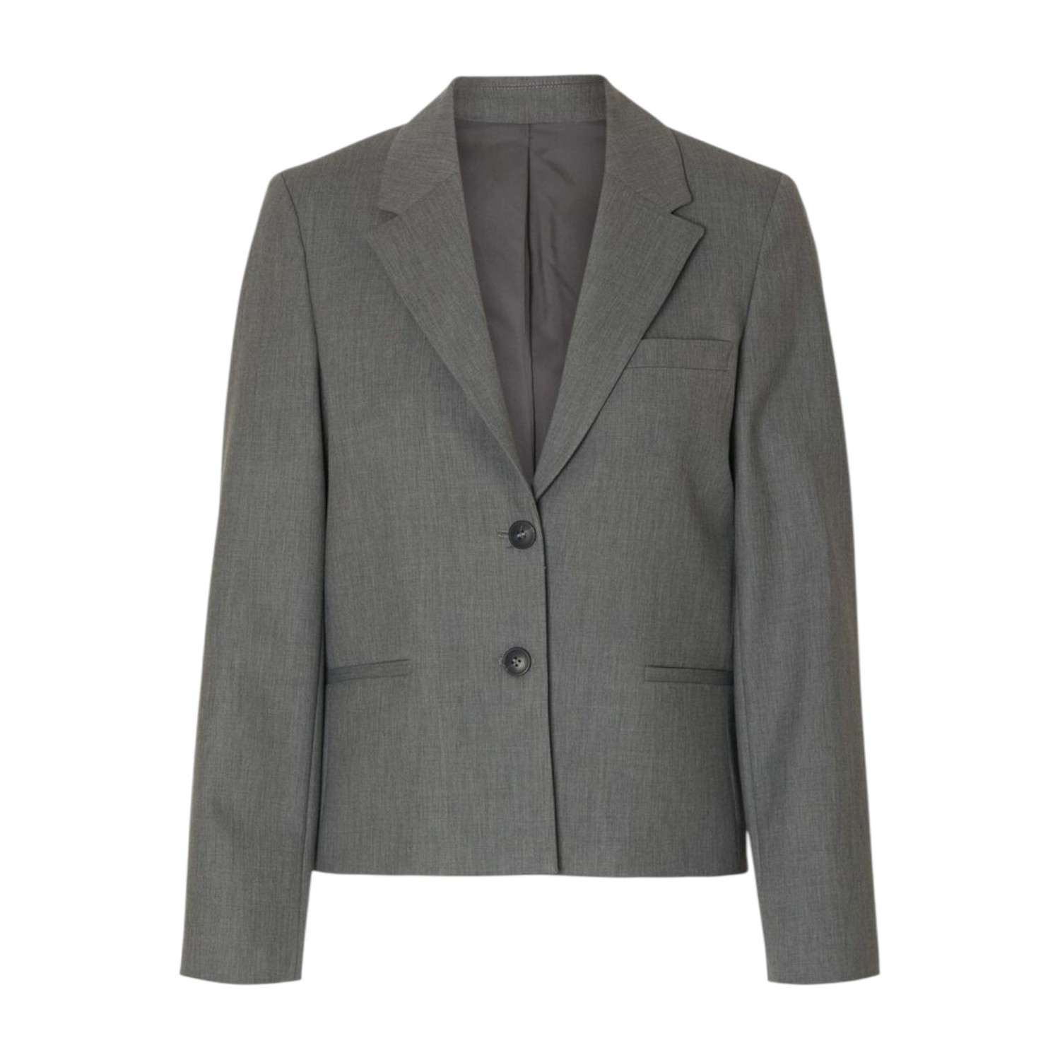 Selected Medium Grey Melange Cropped Blazer. Medium grey melange cropped blazer with single-breasted, notch lapel, buttoned cuffs. Welted chest pocket and welted side pockets.