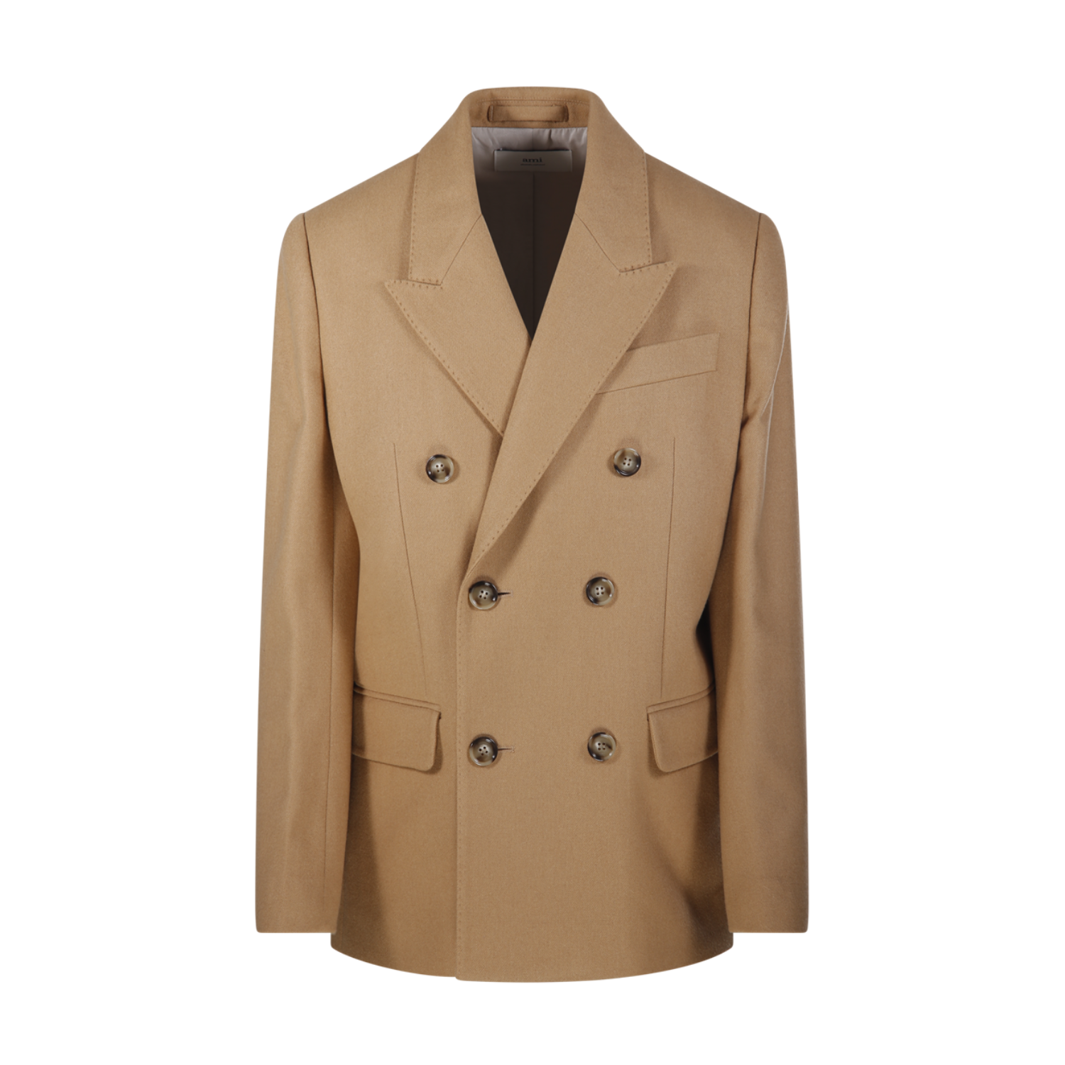 Ami Paris Camel Wool Double-Breasted Blazer. Camel double-breasted wool blazer with front button closure, peak lapels, breast pocket, flap pockets, structured shoulder strap, long sleeves, back vents, cotton lining.