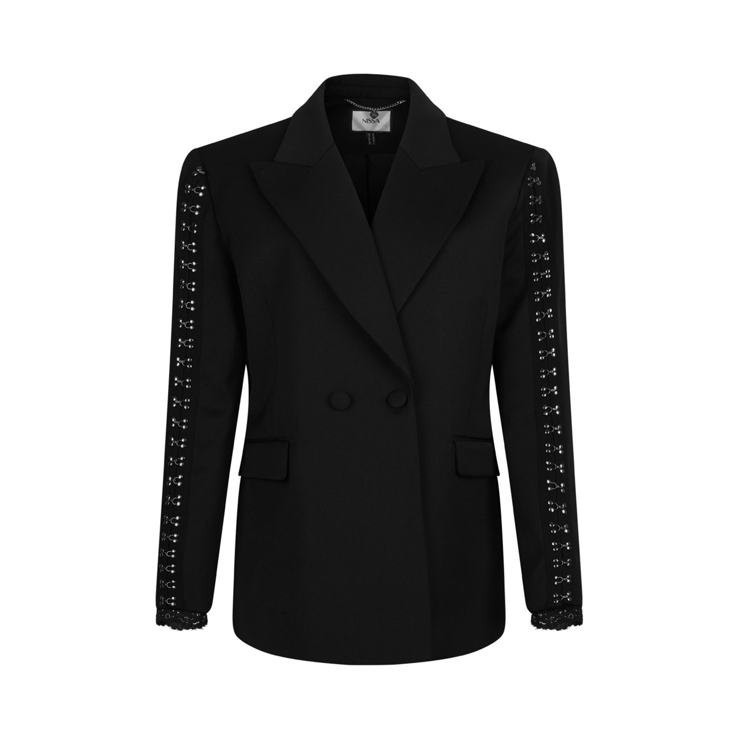 Nissa Black Embellished Double-Breasted Jacket. Black embellished double-breasted jacket with sleeve detailing, long sleeves, lace cuffs.