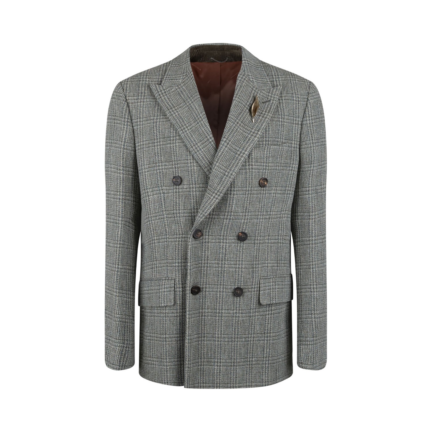 Golden Goose Grey Double-Breasted Blazer. Grey double-breasted blazer made of shetland wool featuring a brass pin on the front. Three pockets on the front. Buttons in the sleeves. Lining with printed jacquard logo. Regular fit.