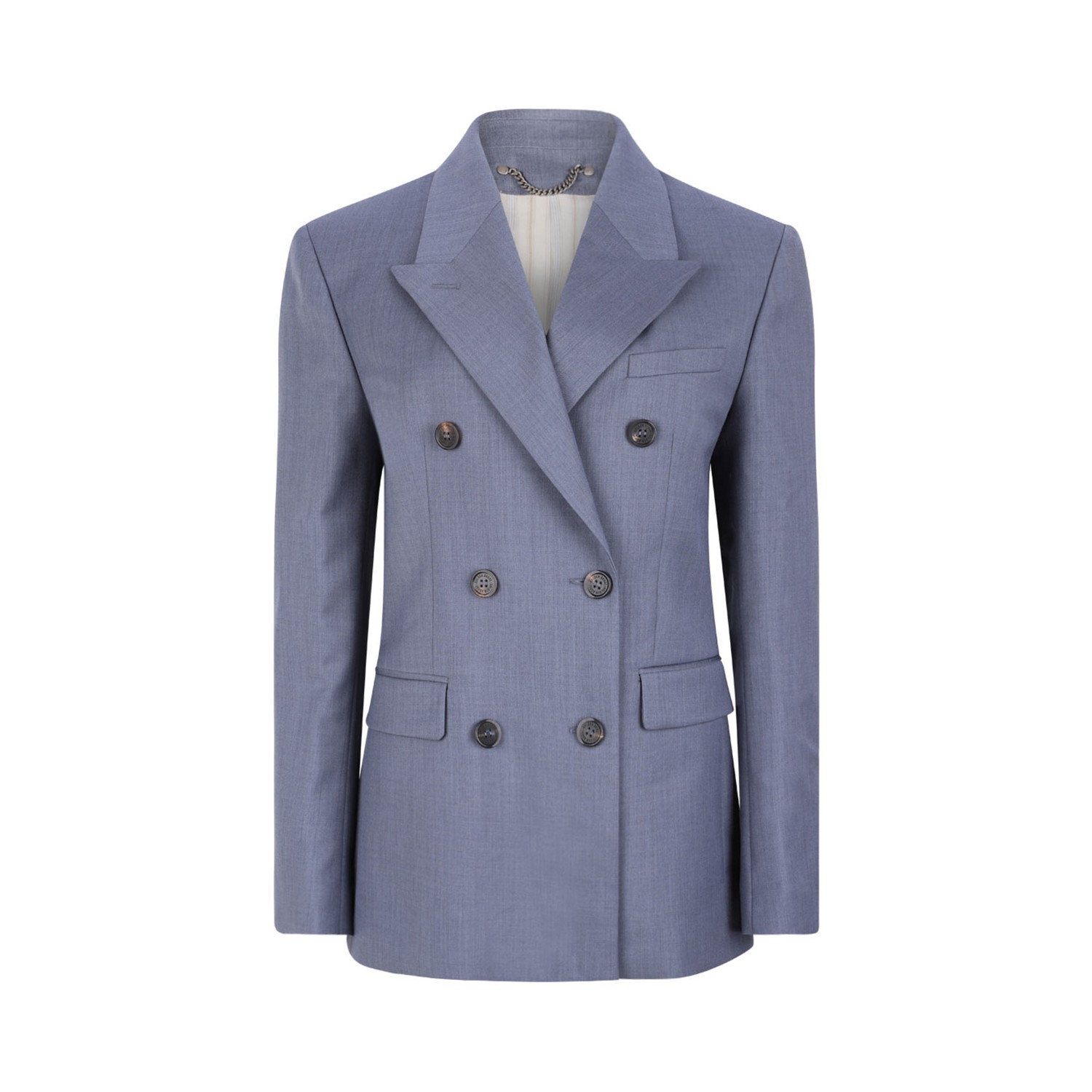 Golden Goose Blue and Grey Journey Blazer. Blue and grey virgin wool blazer with textured finish, double-breasted button fastening, peak lapels, shoulder pads. Long sleeves, buttoned cuffs, chest welt pocket, two side flap pockets. Signature two-stars applique hardware, English rear vents, full lining, straight hem.