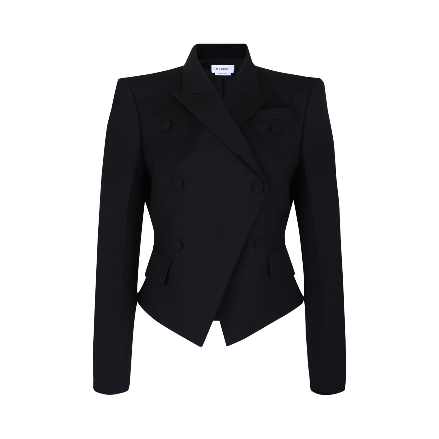 Alexander McQueen Black Blazer. Black blazer with structured shoulders, double-breasted front with tonal covered buttons, peaked lapels, flap pockets, chest welt pocket, and an asymmetrical hemline. Tailored silhouette with a fitted waist.