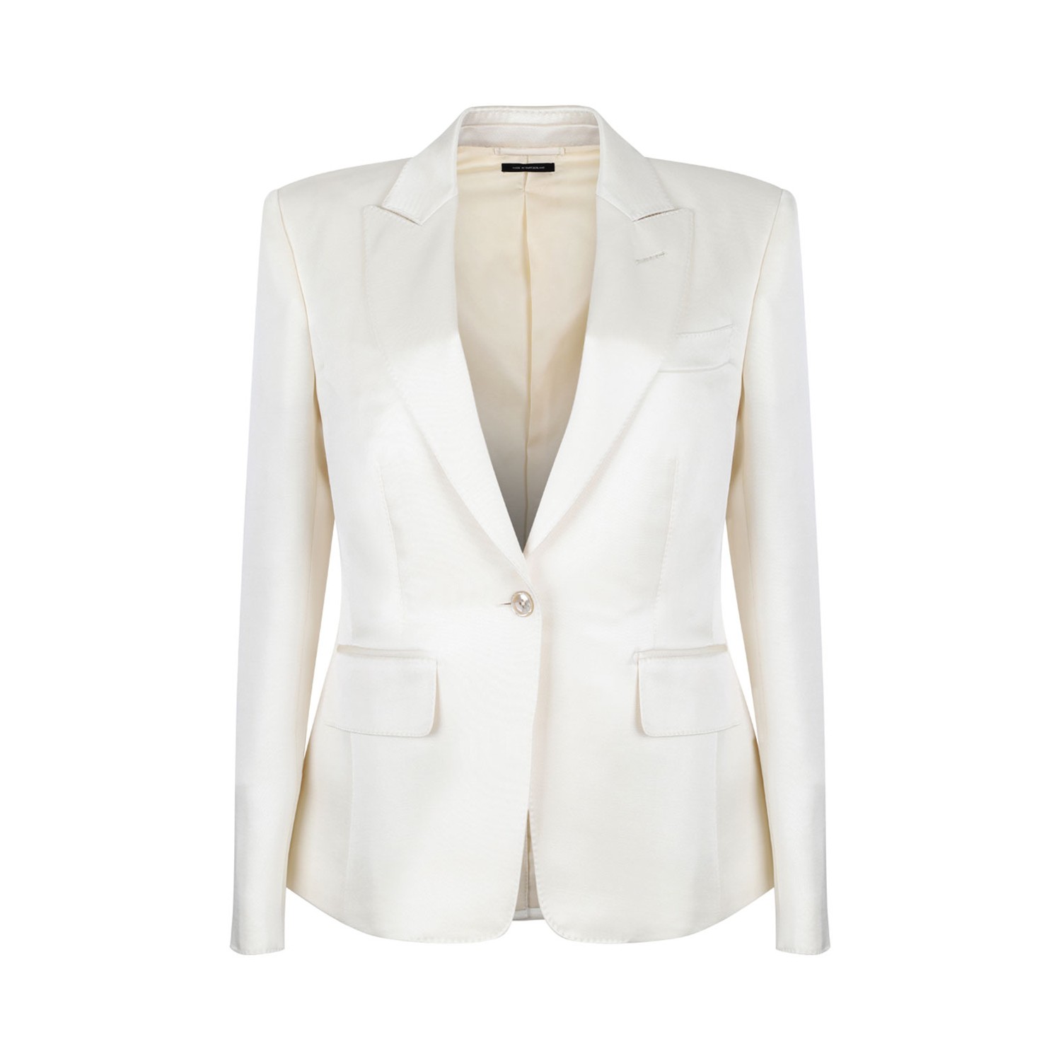 Tom Ford White Single Breasted Blazer. White wool and silk blazer, single breasted peak lapel jacket, barchetta chest pocket, hand made lapel buttonshole. Flap pockets, 5 kissing cuff buttons, internal pockets, single vent, mother of pearl buttons.