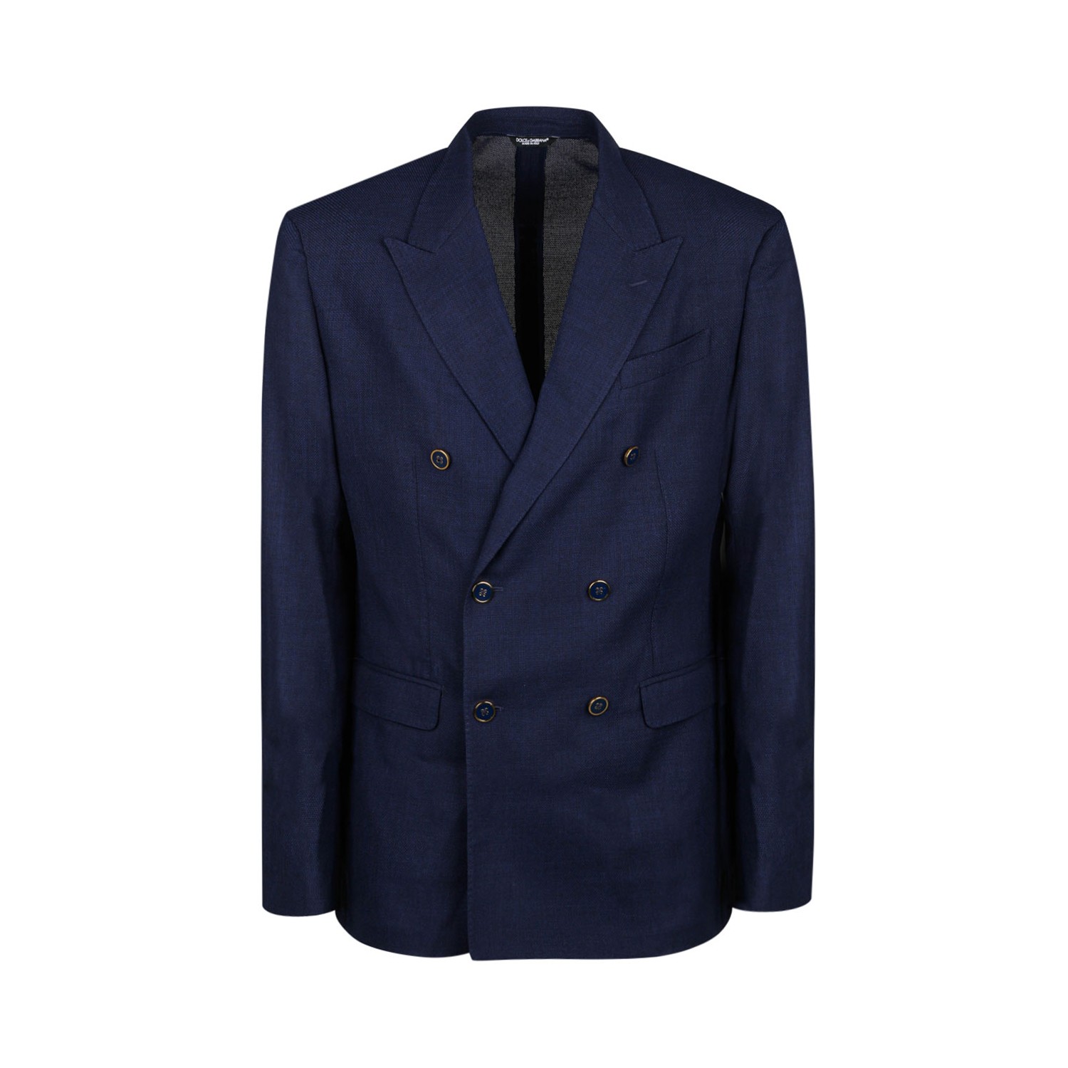 Dolce & Gabbana Blue Wool Double-Breasted Blazer. Blue wool blazer with peaked lapels, buttons with gold piping, breast pocket, front flap pockets and center back slit.