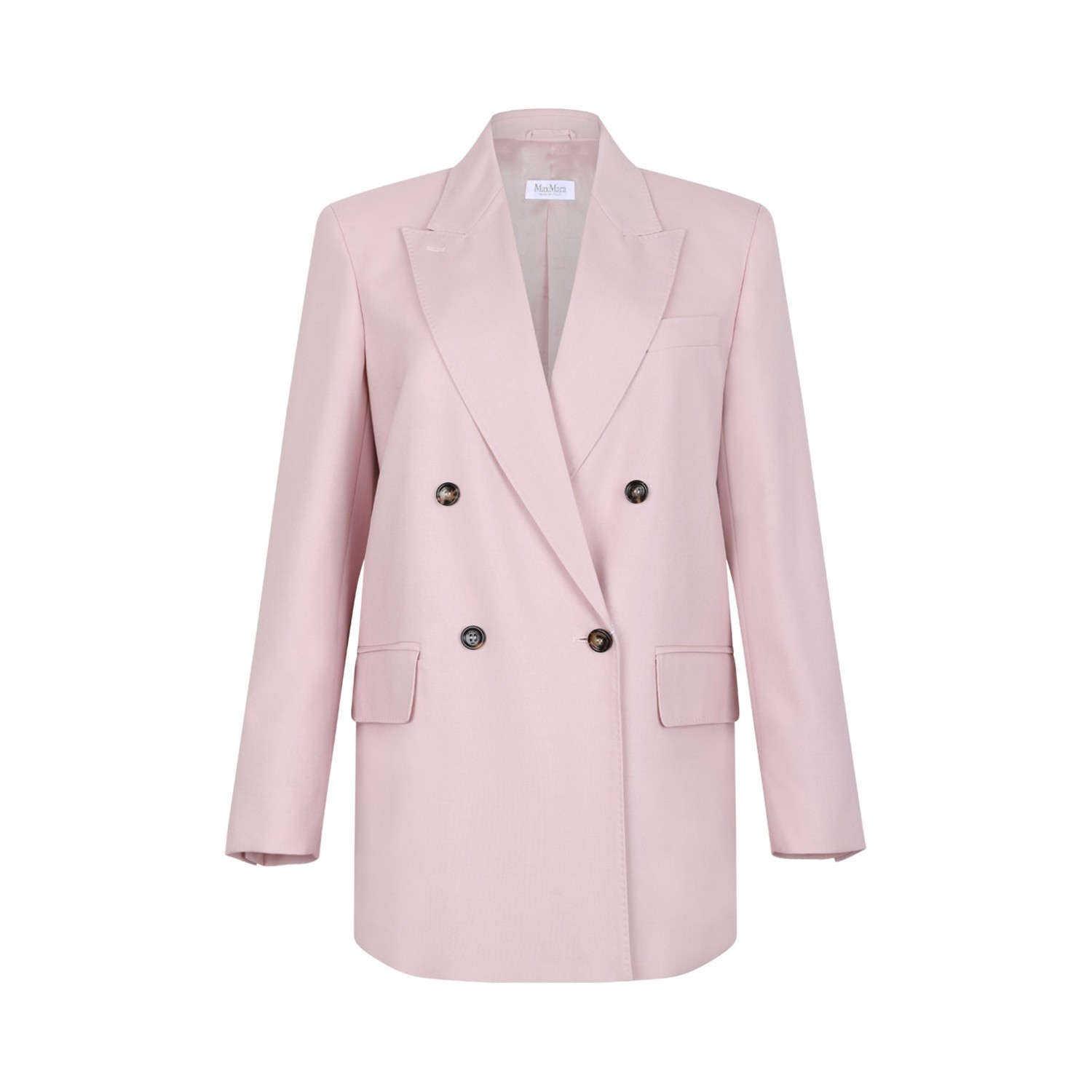 Max Mara Beige Pink Double-Breasted Wool, Mohair, and Silk Blazer. Beige pink double-breasted blazer with an elongated silhouette and oversized volume. Blazer in wool, mohair and silk canvas with peak lapel collar and chest pocket. Set-in sleeves with buttons at the bottom, front closure with visible buttons, welt pockets with flap on the front. Double slit on the back.