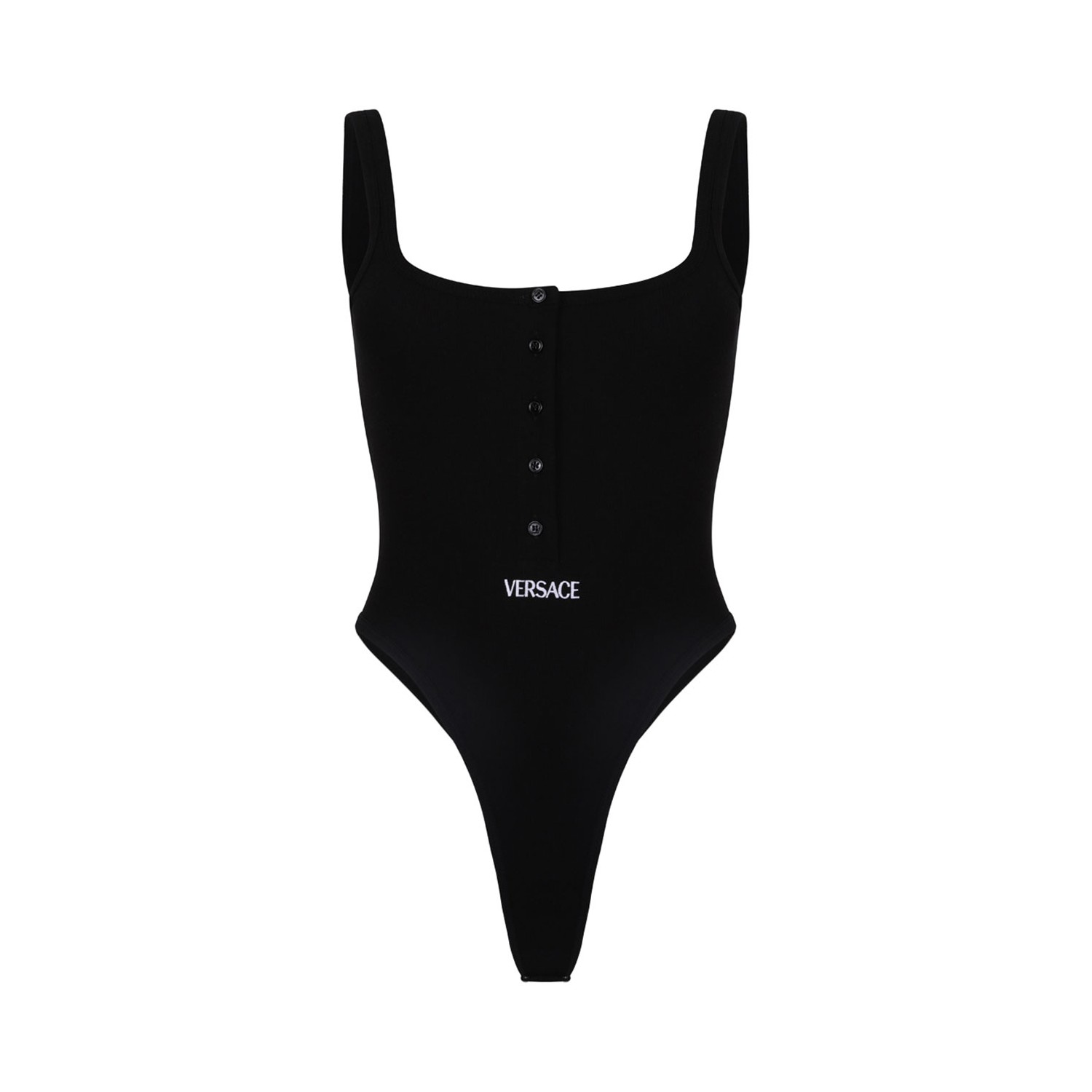 Versace Black Ribbed Bodysuit With Logo. Black high-cut bodysuit in ribbed cotton with a deep neckline, a front button fastening and a Versace Logo thread embroidery.