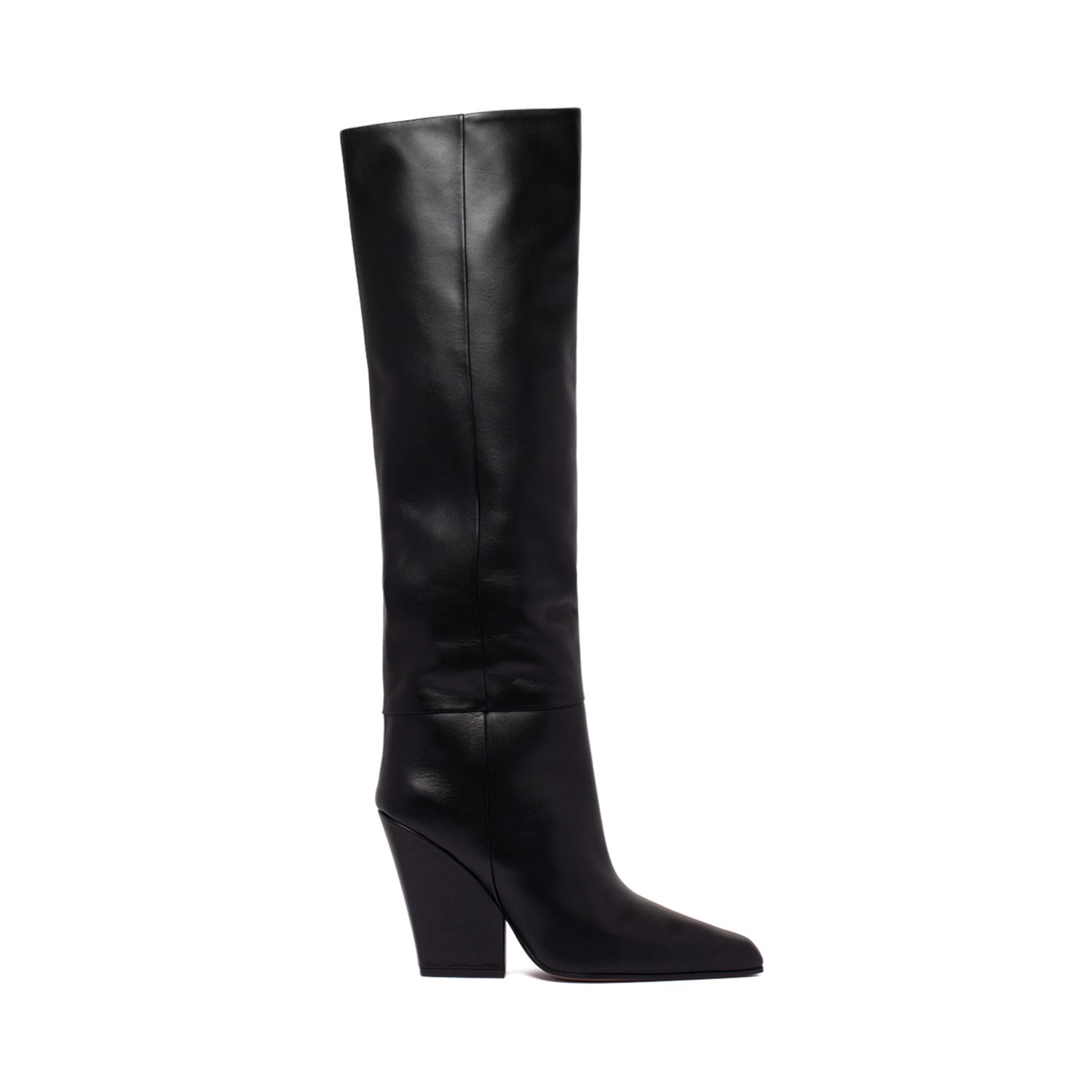 Paris Texas Black Jane Boots. Black leather boots, pointed toe, slip on style. Below knee length, wedge heel, leather sole.
