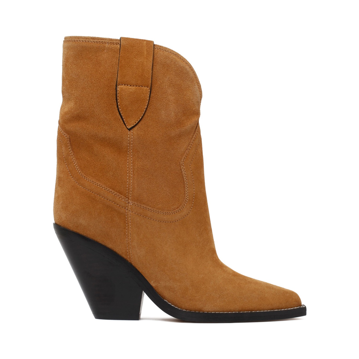 Isabel Marant Camel Brown Leyane Boots. Camel brown calf suede boots, pull on style, pointed toe, 90mm high block heel, panelled design.