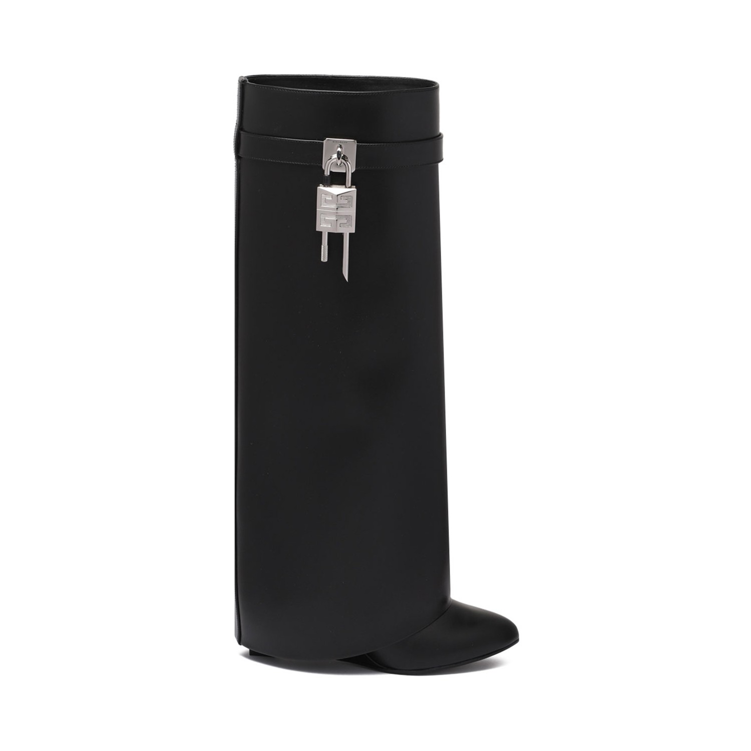 Givenchy Black Shark Lock Leather Boots. Black calf leather boots, smooth grain, polished finish, panelled design. Logo-engraved silver-tone hardware, signature 4G motif, padlock detail. Almond toe, knee-high, pull-on style. 100mm high wedge heel, leather sole.
