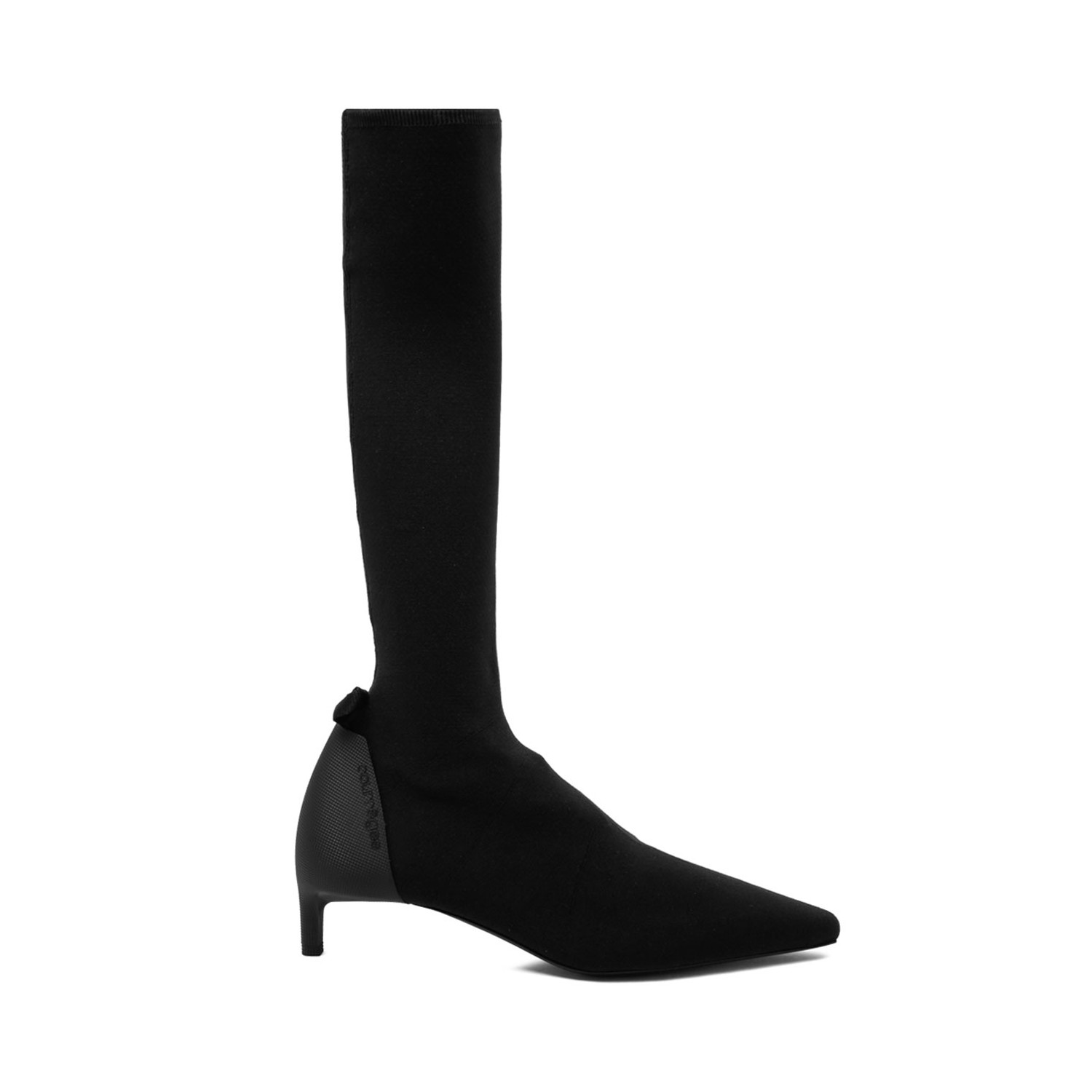 Courreges Black Scuba Stretch Boots. Black Scuba stretch boots with debossed logo to the side, pointed toe, pull-tab at the heel and 40mm low heel.