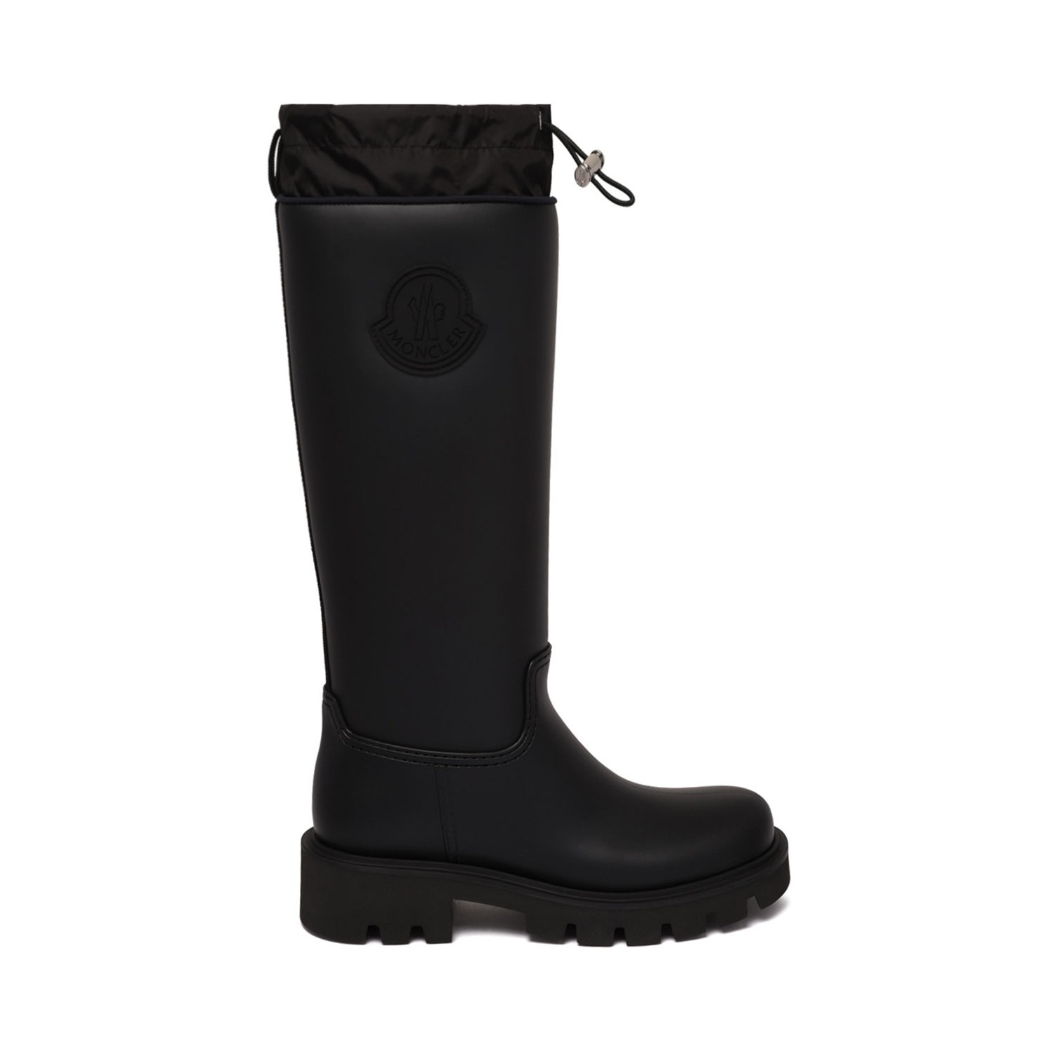 Moncler Black Kickstream High Rain Boots. Black PVC waterproof high rain boots with exposed nylon lining, drawstring closure. Rubber logo patch on the side, EVA and rubber sole with studs, block heel.