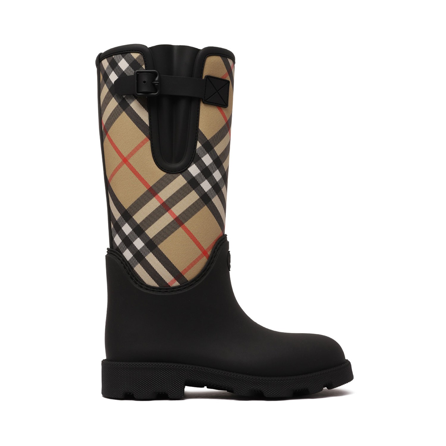 Burberry Black Rubber Marsh Stamp High Boots. Black rain boots made from rubber and a nylon blend, woven with the Burberry Check. Rounded toe, adjustable buckled strap, Burberry lettering at sole.