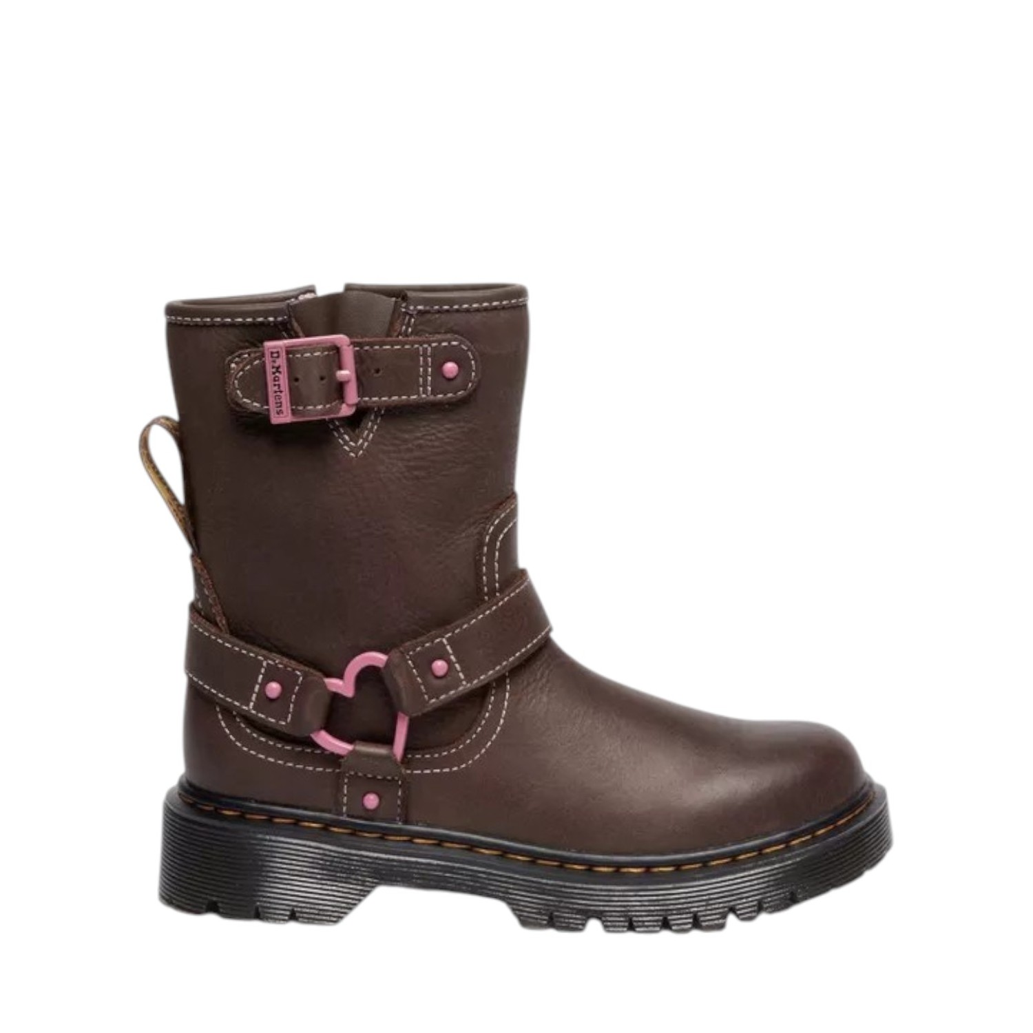 Dr. Martens Kids Dark Brown Genaya Leather Biker Boots. Smaller in size, but still with the same Doc's attitude. The Genaya biker boots embody bold biker style, but for smaller fans. Crafted from lightweight Wyoming leather, this silhouette is built for any challenge, featuring a contrasting adjustable buckle and bold details. It's all finished with our signature AirWair tongue and flexible Bex Kids smoked outsole, further reinforced with signature yellow stitching.
