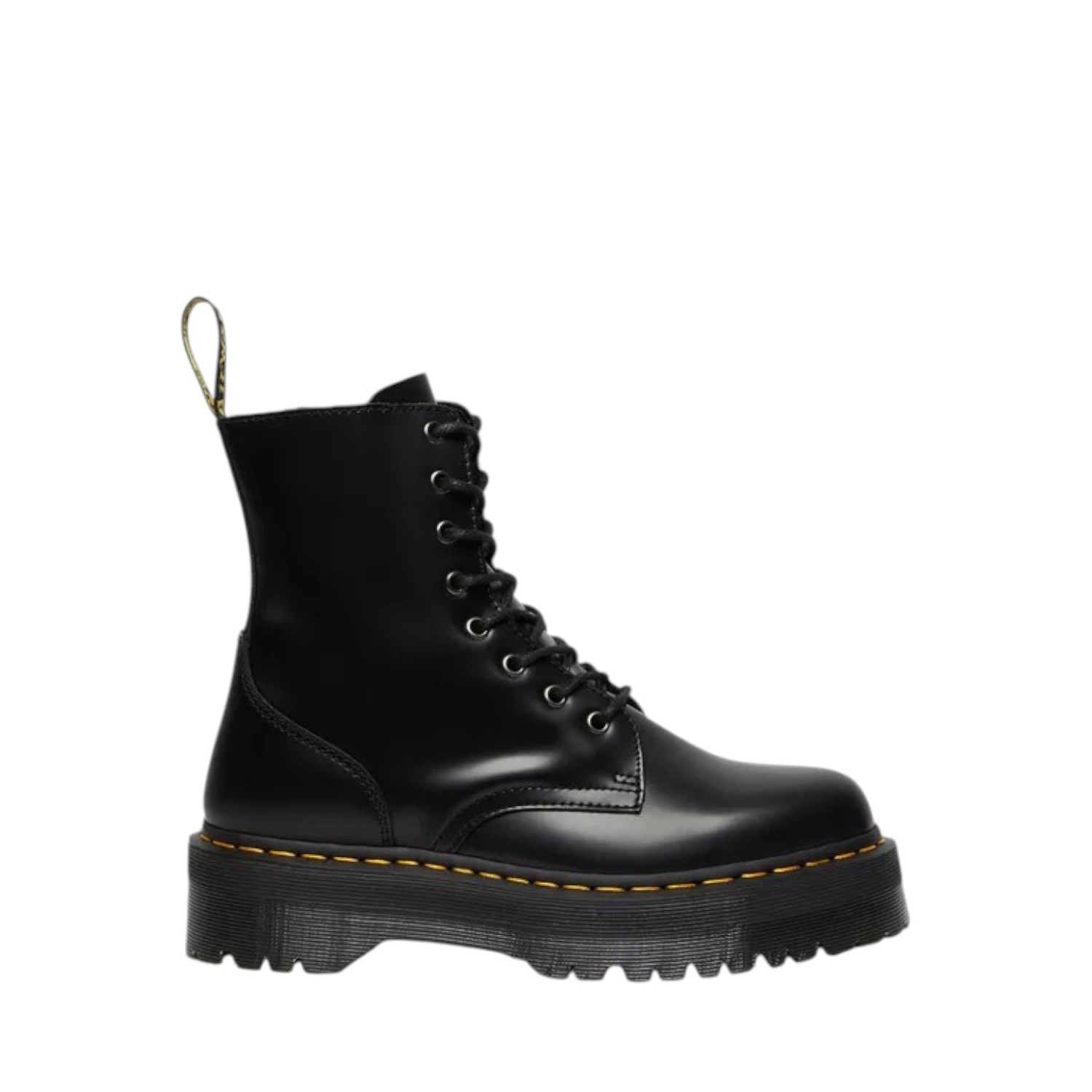 Dr. Martens Black Jadon Smooth Leather Platform Boots. Jadon boot embodies six decades of Dr. Martens DNA: a style that's not afraid to make a statement with its chunky platform sole. Inspired by our 8-eye Original, the Jadon boot is crafted from Polished Smooth leather, which you can buff to a shine or leave to show signs of wear. The signature Quad sole features a grooved pattern and is finished with our signature yellow stitching. The heel features the signature black and yellow tongue. The boot also features a convenient side zip. Whatever your look, be bold.