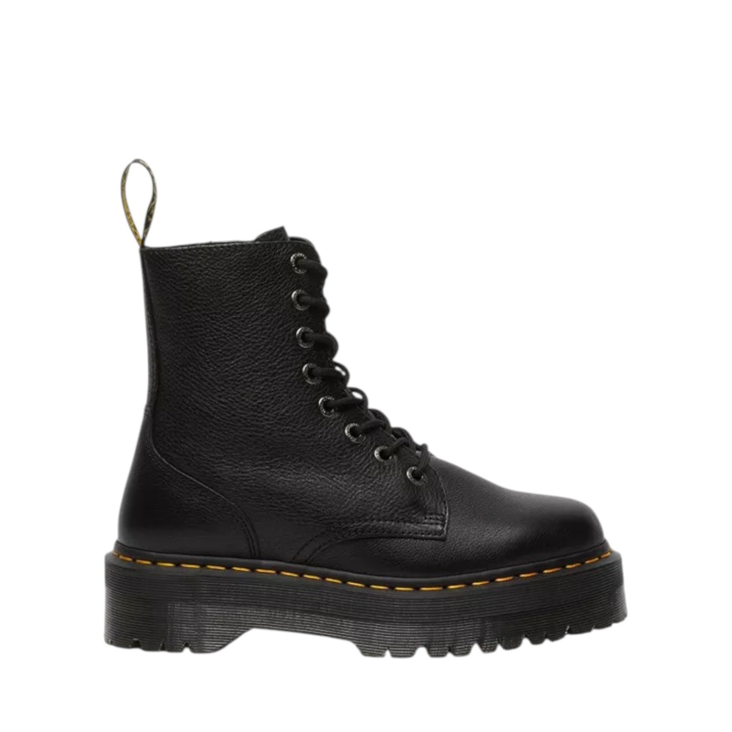 Dr. Martens Black Jadon III Pisa Leather Platform Boots. Sitting on a 4.7 cm sole, this imposing boot has been reimagined in Pisa, a supple, midweight, milled leather with a fine grain and a waxy finish. These platform boots are finished with a black and yellow heel loop and signature yellow stitching.