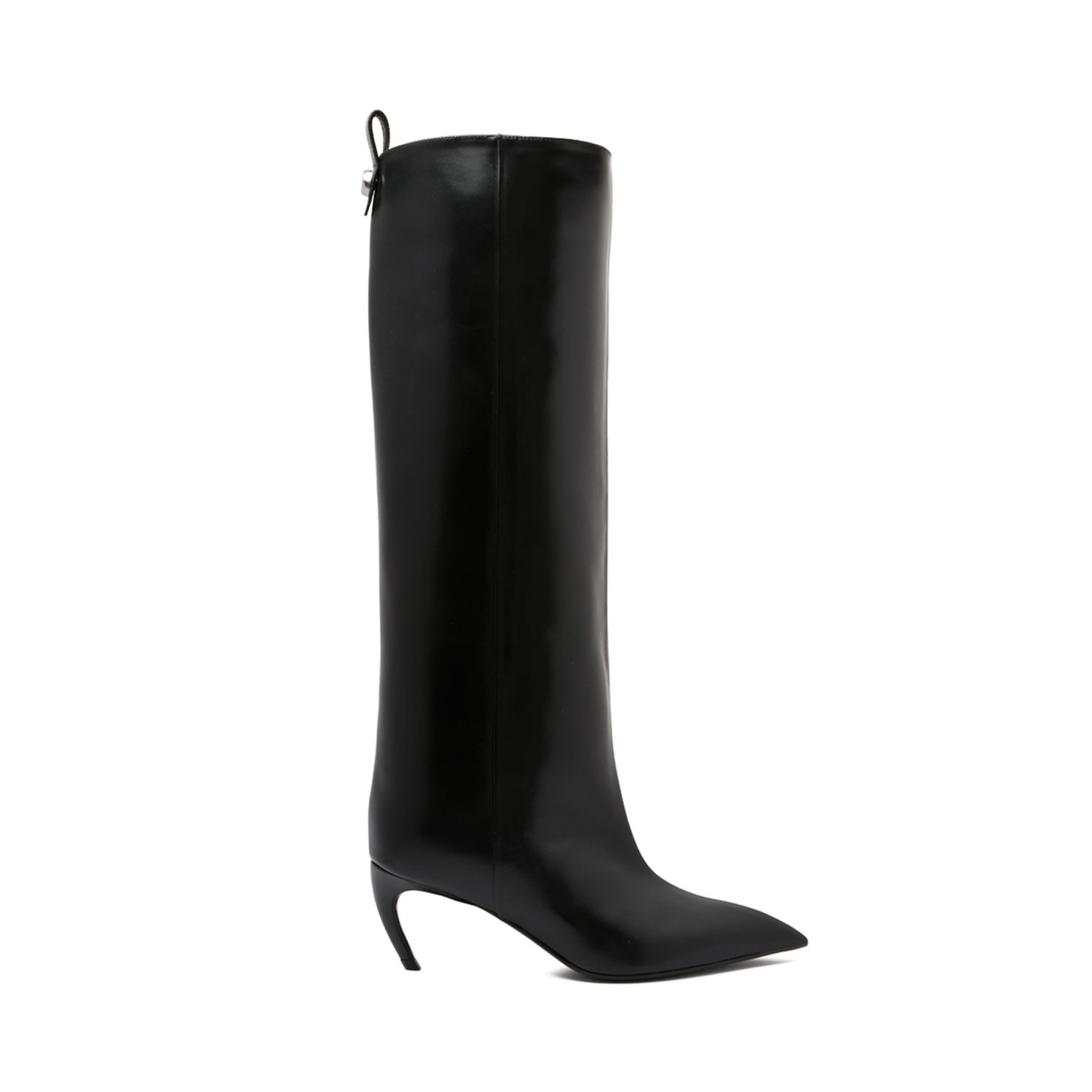 The Attico Black Lea Boots. Black Lea boots with, pull-tab at the heel, mid sculpted heel, pointed toe and crystal embellishment.