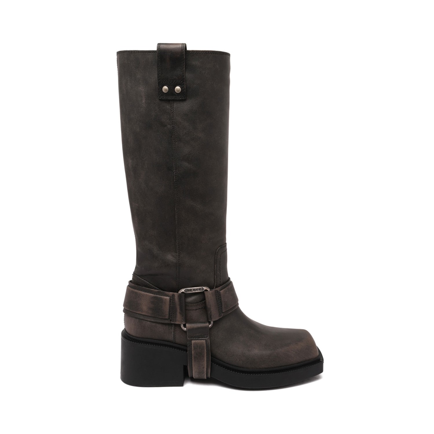 Vic Matie Smog Grey Buckle-Strap Leather Boots. Smog grey leather boots with buckle strap, high shaft, block heel and metal detail.
