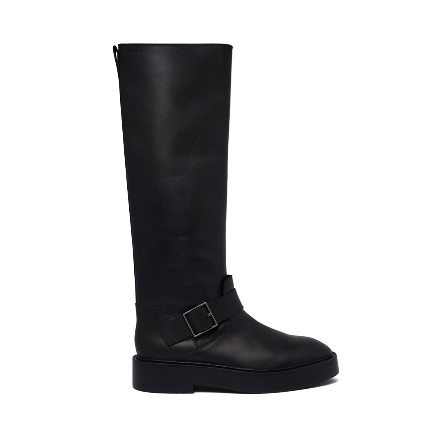 Calvin Klein Black Leather Knee High Biker Boots. Black leather biker boots with round toe, urved leather edge, leather overlay outsole.