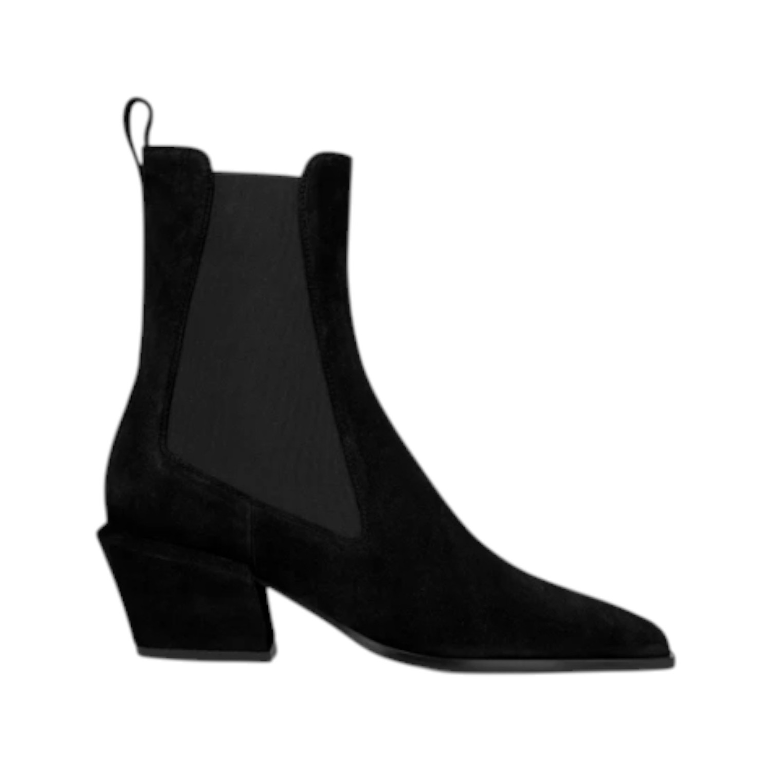 Paris Texas Black Bettina Ankle Boots 50. Black ankle boots in calf suede leather with an elasticated side panel, covered chunky heel.