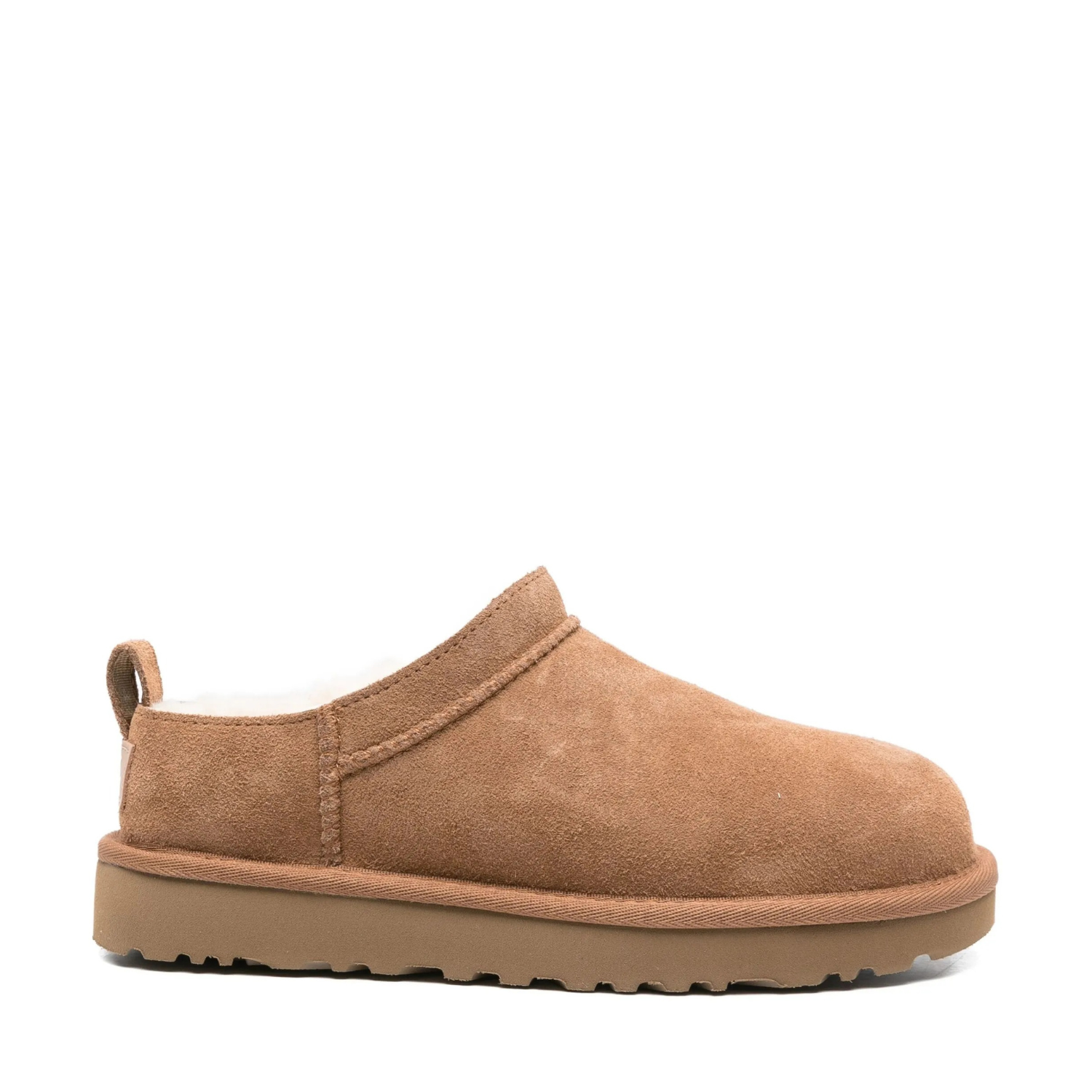 UGG Chestnut Classic Micro Boots. Chestnut Classic Micro chestnut boot features a new low-profile design (and exceptional comfort). This style features a genuine suede upper lined with ultra-soft sheepskin, a material that naturally regulates temperature, giving you the choice of wearing socks or not. The lightweight sugarcane EVA outsole offers natural support and makes it as comfortable as a slipper. Pull tab at the back. Woven UGG logo label on the insole, leather label with embossed UGG logo on the heel. This product is made with real sheep or lamb fur. Fur sourced from Australia, Ireland, the United Kingdom, or the United States. Artificially treated and dyed.