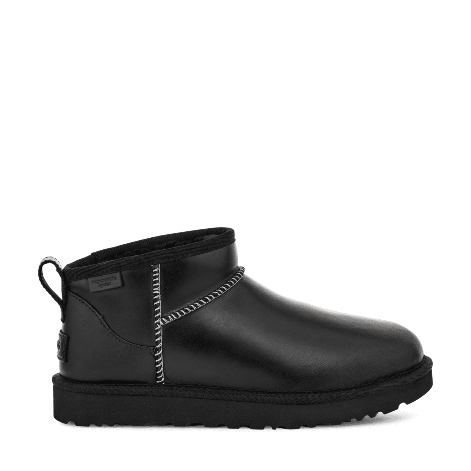 UGG Black Classic Ultra Mini Leather Boots. Black genuine leather boots with UGG patch sewn on the heel, reinforced heel, heel pull, grip sole, faux fur lining.