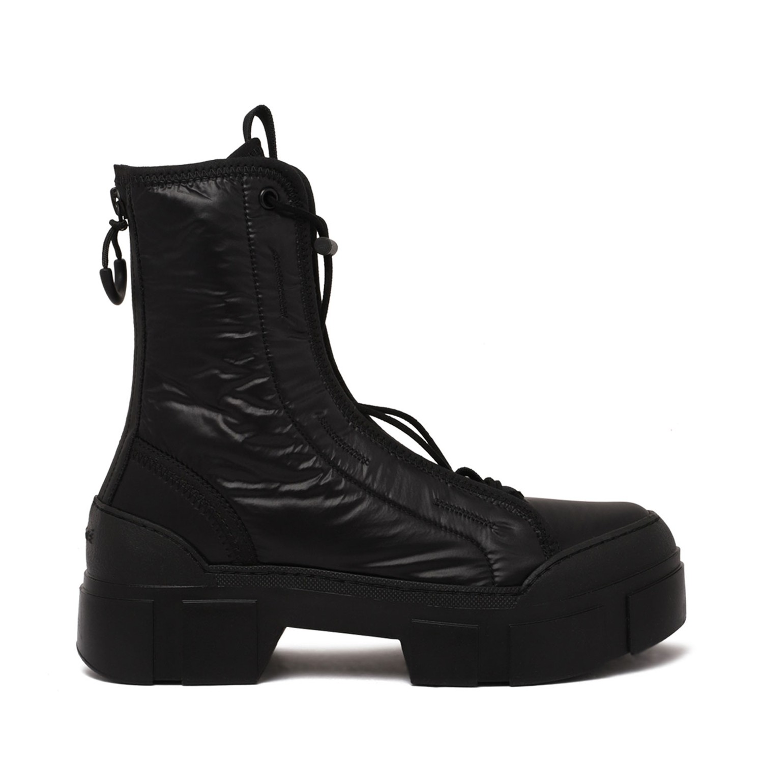 Vic Matie Black Roccia Combat Boots. Black combat boot with front lace-up fastening, panelled design, round toe. Rear zip fastening and chunky rubber sole.