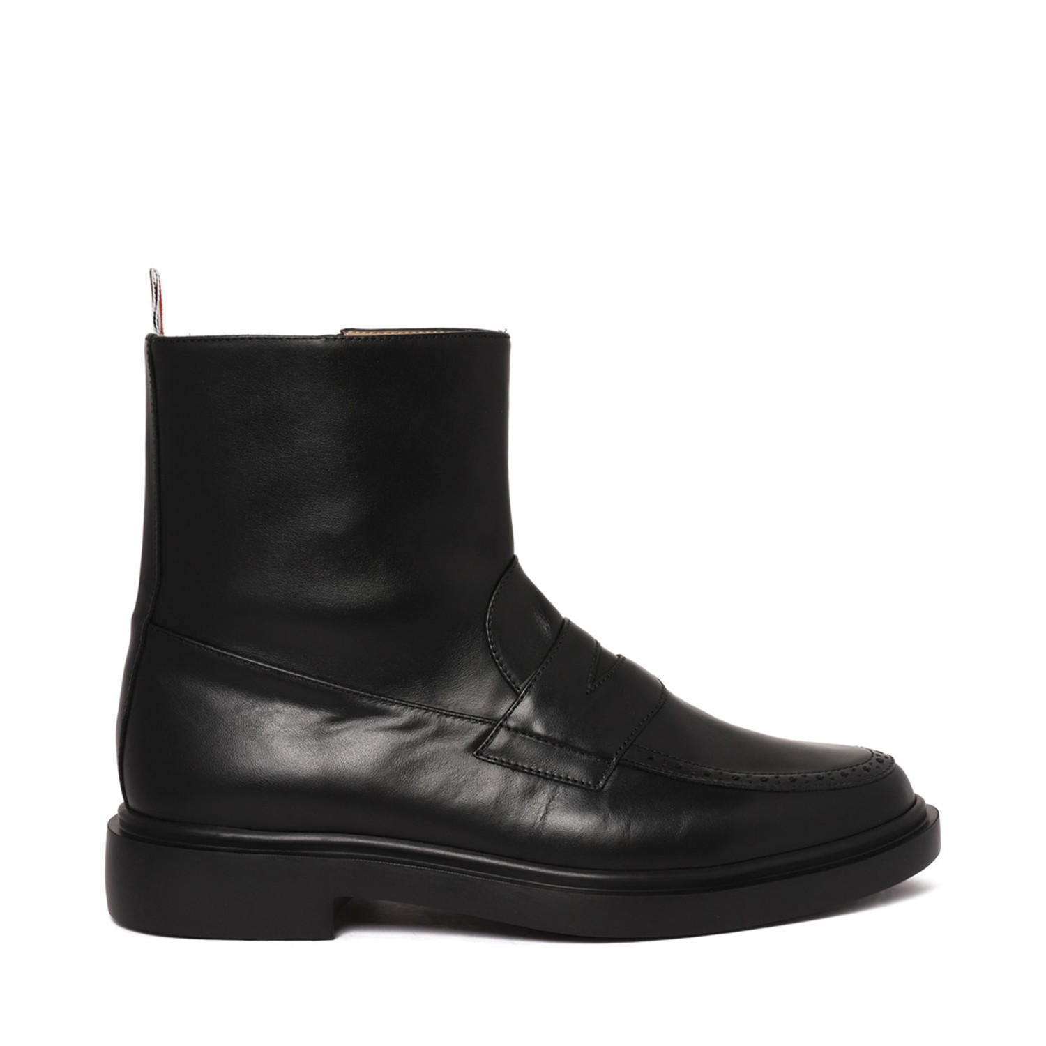 Thom Browne Black Ankle Boots. Black calf leather penny loafers with pull-tab at the heel, penny slot. Short side zip fastening and almond toe.