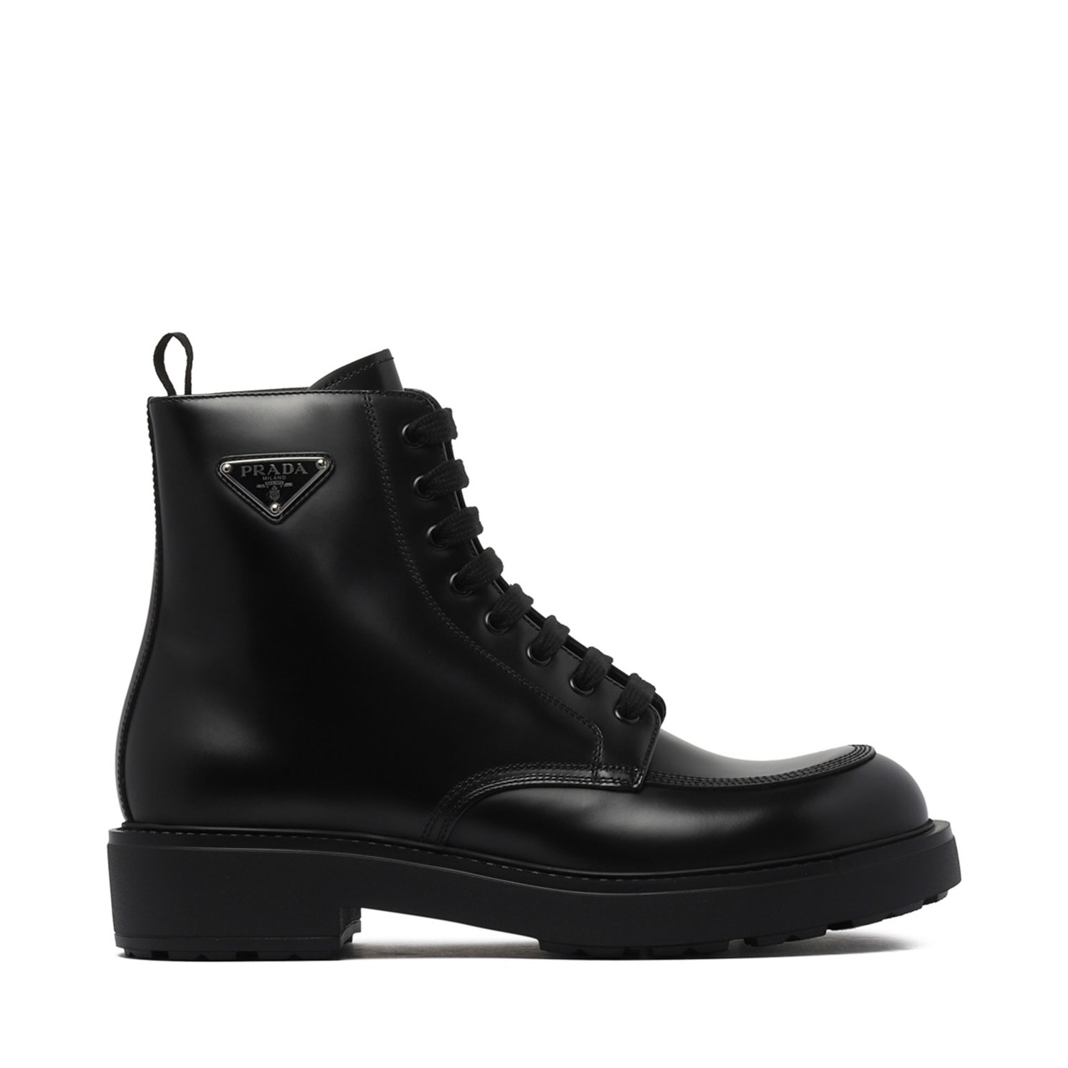 Prada Black Leather Boots. Black leather boots, brushed finish, front lace up fastening, pull tab at the heel. Enamel triangle logo, round toe, rubber outsole.
