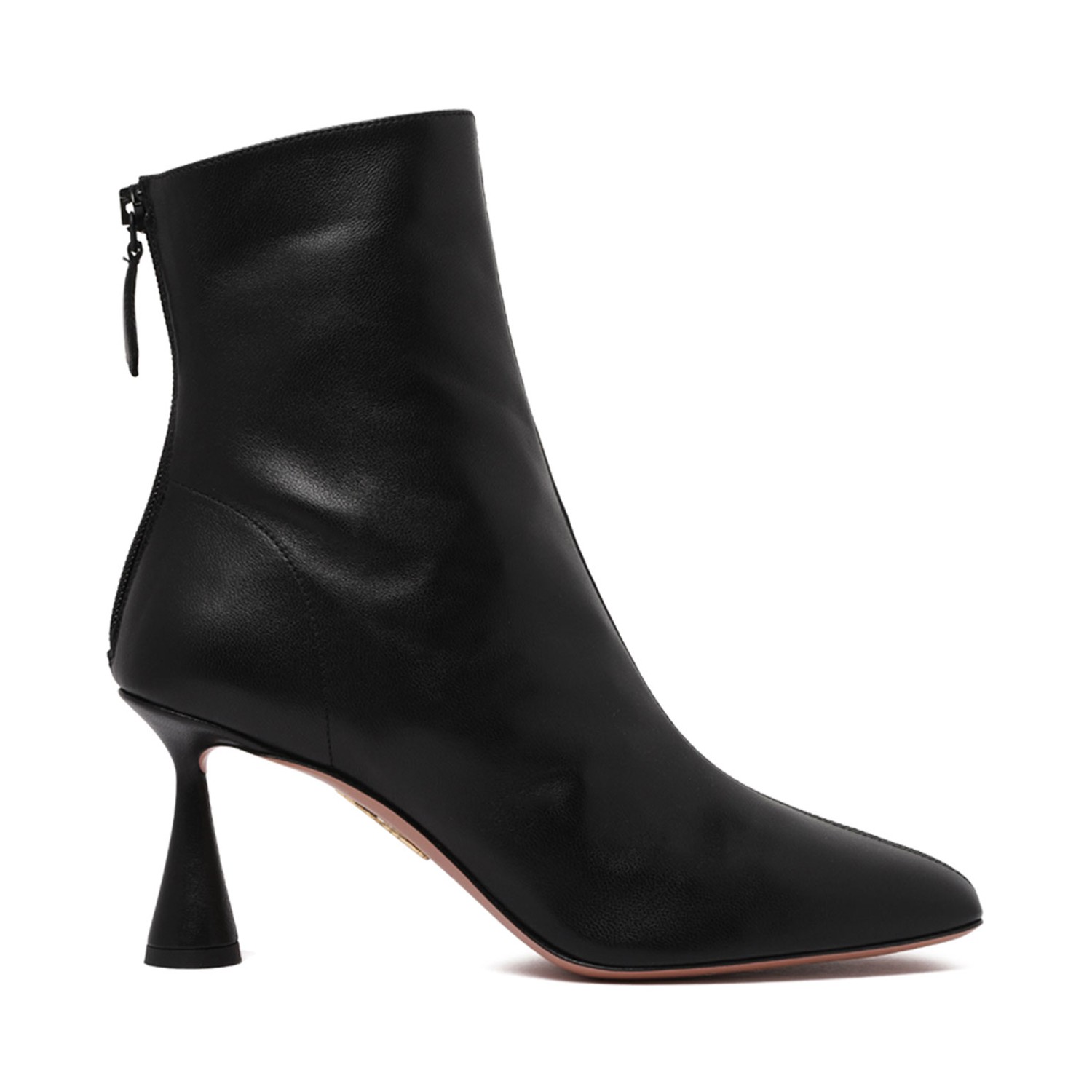 Aquazzura Black Amore Ankle Boots. Black calf leather ankle boots with square toe, grained texture, branded leather insole. Leather sole, 70mm high tapered heel and rear zip fastening.